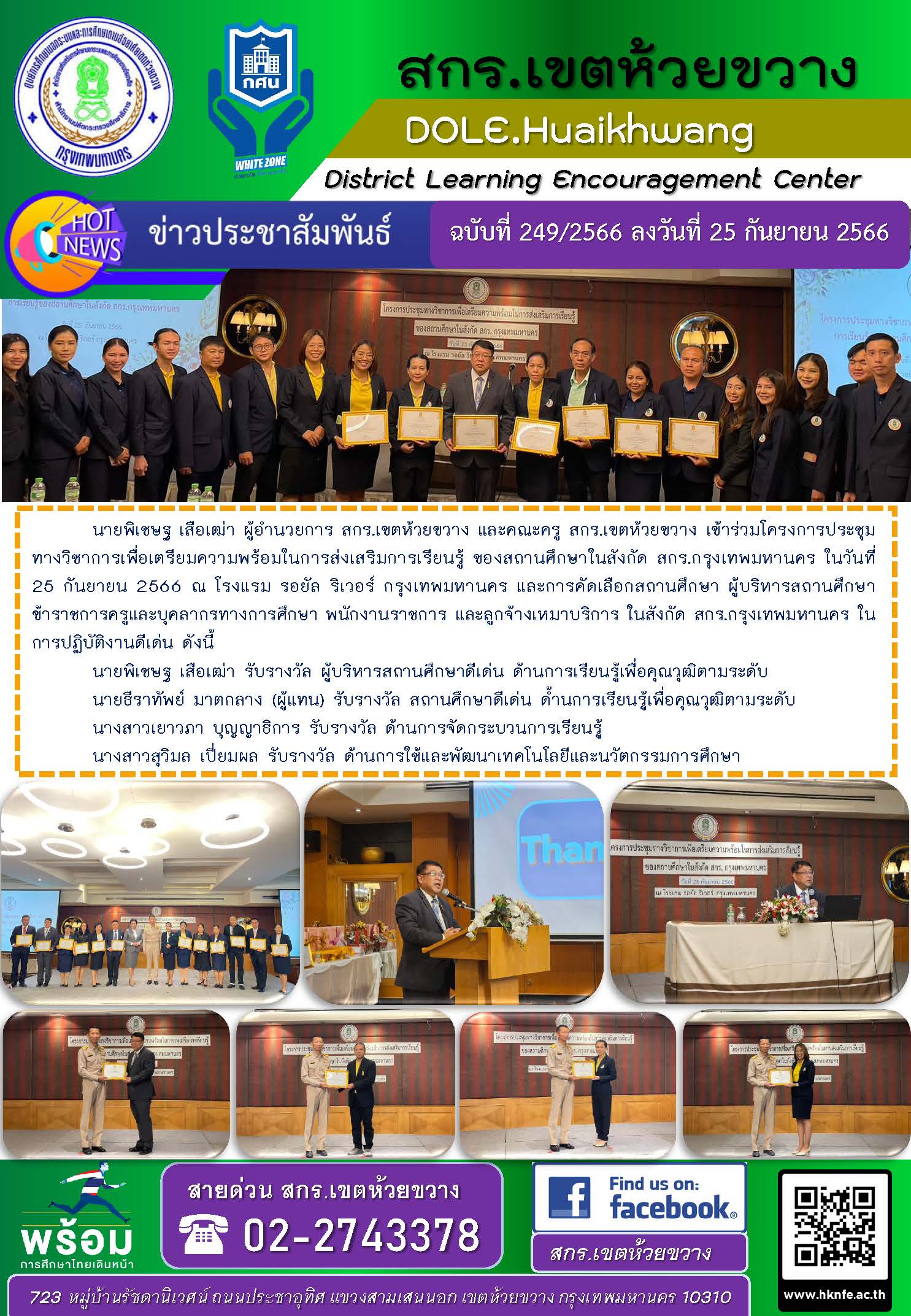 นายพิเชษฐ เสือเฒ่า ผู้อำนวยการ สกร.เขตห้วยขวาง และคณะครู สกร.เขตห้วยขวาง เข้าร่วมโครงการประชุมทางวิชาการเพื่อเตรียมความพร้อมในการส่งเสริมการเรียนรู้ ของสถานศึกษาในสังกัด สกร.กรุงเทพมหานคร ในวันที่ 25 กันยายน 2566 ณ โรงแรม รอยัล ริเวอร์ กรุงเทพมหานคร