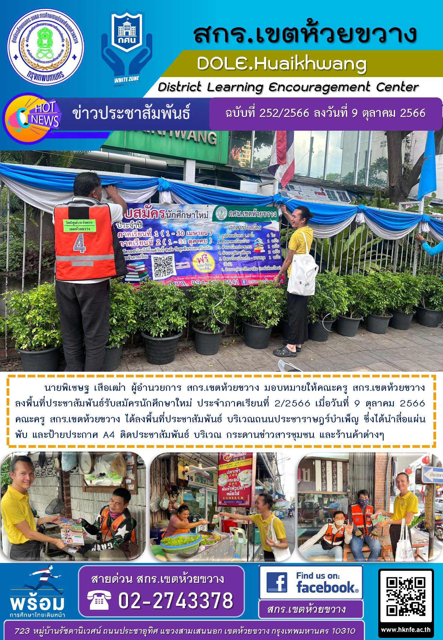 นายพิเชษฐ เสือเฒ่า ผู้อำนวยการ สกร.เขตห้วยขวาง มอบหมายให้คณะครู สกร.เขตห้วยขวาง ลงพื้นที่ประชาสัมพันธ์รับสมัครนักศึกษาใหม่ ประจำภาคเรียนที่ 2/2566 เมื่อวันที่ 9 ตุลาคม 2566 คณะครู สกร.เขตห้วยขวาง ได้ลงพื้นที่ประชาสัมพันธ์ บริเวณถนนประชาราษฎร์บำเพ็ญ ซึ่งได้นำสื่อแผ่นพับ และป้ายประกาศ A4 ติดประชาสัมพันธ์ บริเวณ กระดานข่าวสารชุมชน และร้านค้าต่างๆ