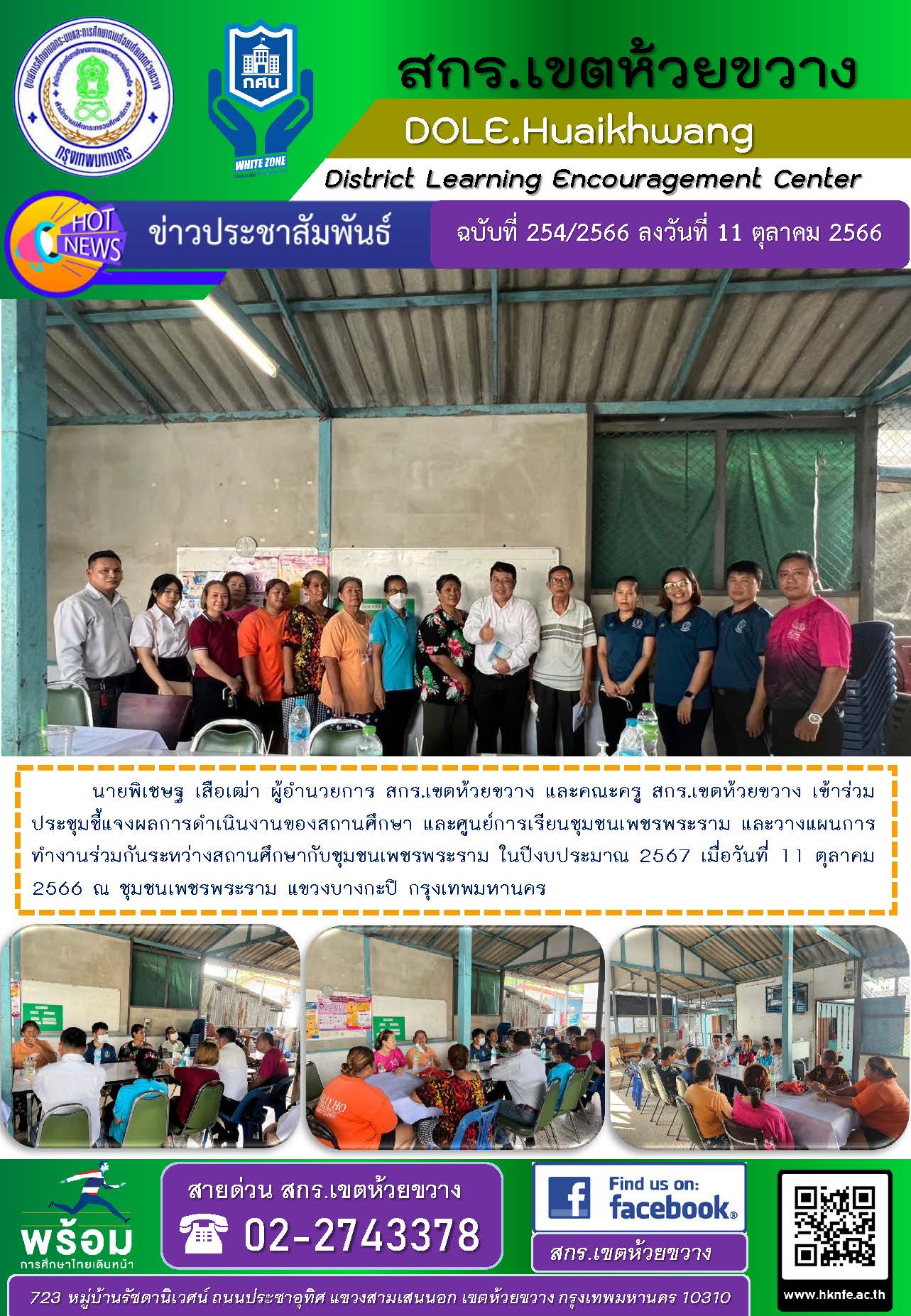 นายพิเชษฐ เสือเฒ่า ผู้อำนวยการ สกร.เขตห้วยขวาง และคณะครู สกร.เขตห้วยขวาง เข้าร่วมประชุมชี้แจงผลการดำเนินงานของสถานศึกษา และศูนย์การเรียนชุมชนเพชรพระราม และวางแผนการทำงานร่วมกันระหว่างสถานศึกษากับชุมชนเพชรพระราม ในปีงบประมาณ 2567 เมื่อวันที่ 11 ตุลาคม 2566 ณ ชุมชนเพชรพระราม แขวงบางกะปิ กรุงเทพมหานคร