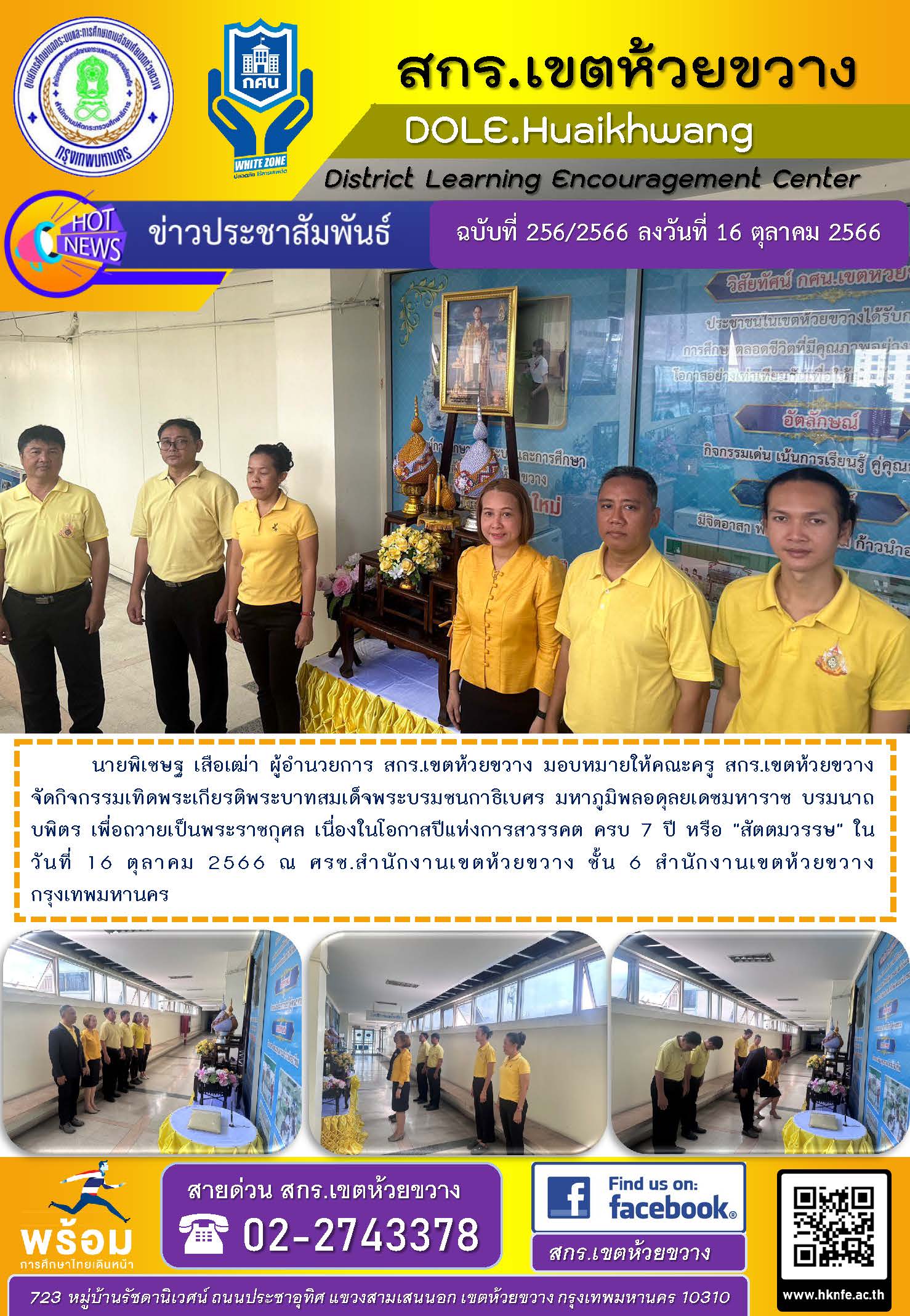 นายพิเชษฐ เสือเฒ่า ผู้อำนวยการ สกร.เขตห้วยขวาง มอบหมายให้คณะครู สกร.เขตห้วยขวาง จัดกิจกรรมเทิดพระเกียรติพระบาทสมเด็จพระบรมชนกาธิเบศร มหาภูมิพลอดุลยเดชมหาราช บรมนาถบพิตร เพื่อถวายเป็นพระราชกุศล เนื่องในโอกาสปีแห่งการสวรรคต ครบ 7 ปี หรือ "สัตตมวรรษ" ในวันที่ 16 ตุลาคม 2566 ณ ศรช.สำนักงานเขตห้วยขวาง ชั้น 6 สำนักงานเขตห้วยขวาง กรุงเทพมหานคร