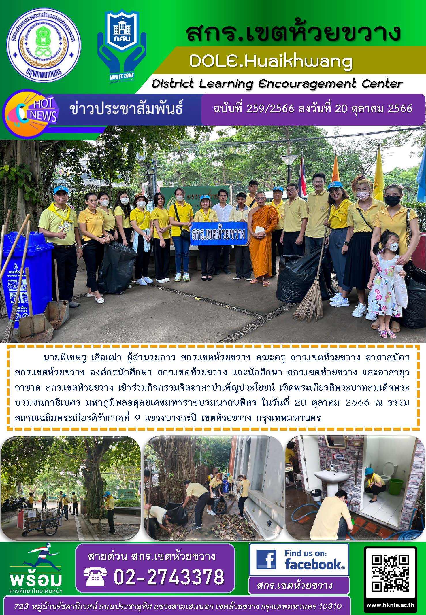 นายพิเชษฐ เสือเฒ่า ผู้อำนวยการ สกร.เขตห้วยขวาง คณะครู สกร.เขตห้วยขวาง อาสาสมัคร สกร.เขตห้วยขวาง องค์กรนักศึกษา สกร.เขตห้วยขวาง และนักศึกษา สกร.เขตห้วยขวาง และอาสายุวกาชาด สกร.เขตห้วยขวาง เข้าร่วมกิจกรรมจิตอาสาบำเพ็ญประโยชน์ เทิดพระเกียรติพระบาทสมเด็จพระบรมชนกาธิเบศร มหาภูมิพลอดุลยเดชมหาราชบรมนาถบพิตร ในวันที่ 20 ตุลาคม 2566 ณ ธรรมสถานเฉลิมพระเกียรติรัชกาลที่ 9 แขวงบางกะปิ เขตห้วยขวาง กรุงเทพมหานคร