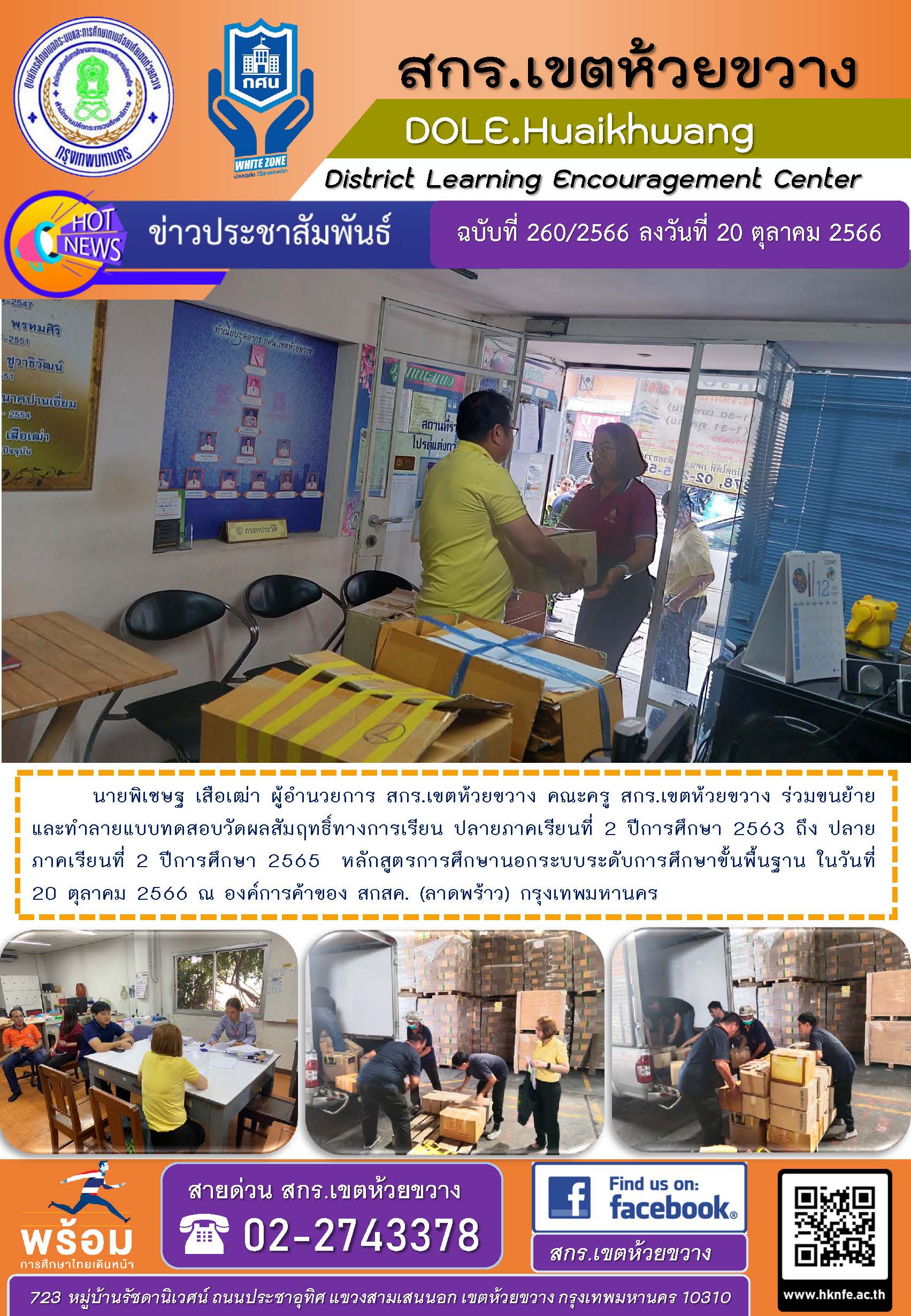 นายพิเชษฐ เสือเฒ่า ผู้อำนวยการ สกร.เขตห้วยขวาง คณะครู สกร.เขตห้วยขวาง ร่วมขนย้ายและทำลายแบบทดสอบวัดผลสัมฤทธิ์ทางการเรียน ปลายภาคเรียนที่ 2 ปีการศึกษา 2563 ถึง ปลายภาคเรียนที่ 2 ปีการศึกษา 2565 หลักสูตรการศึกษานอกระบบระดับการศึกษาขั้นพื้นฐาน ในวันที่ 20 ตุลาคม 2566 ณ องค์การค้าของ สกสค. (ลาดพร้าว) กรุงเทพมหานคร