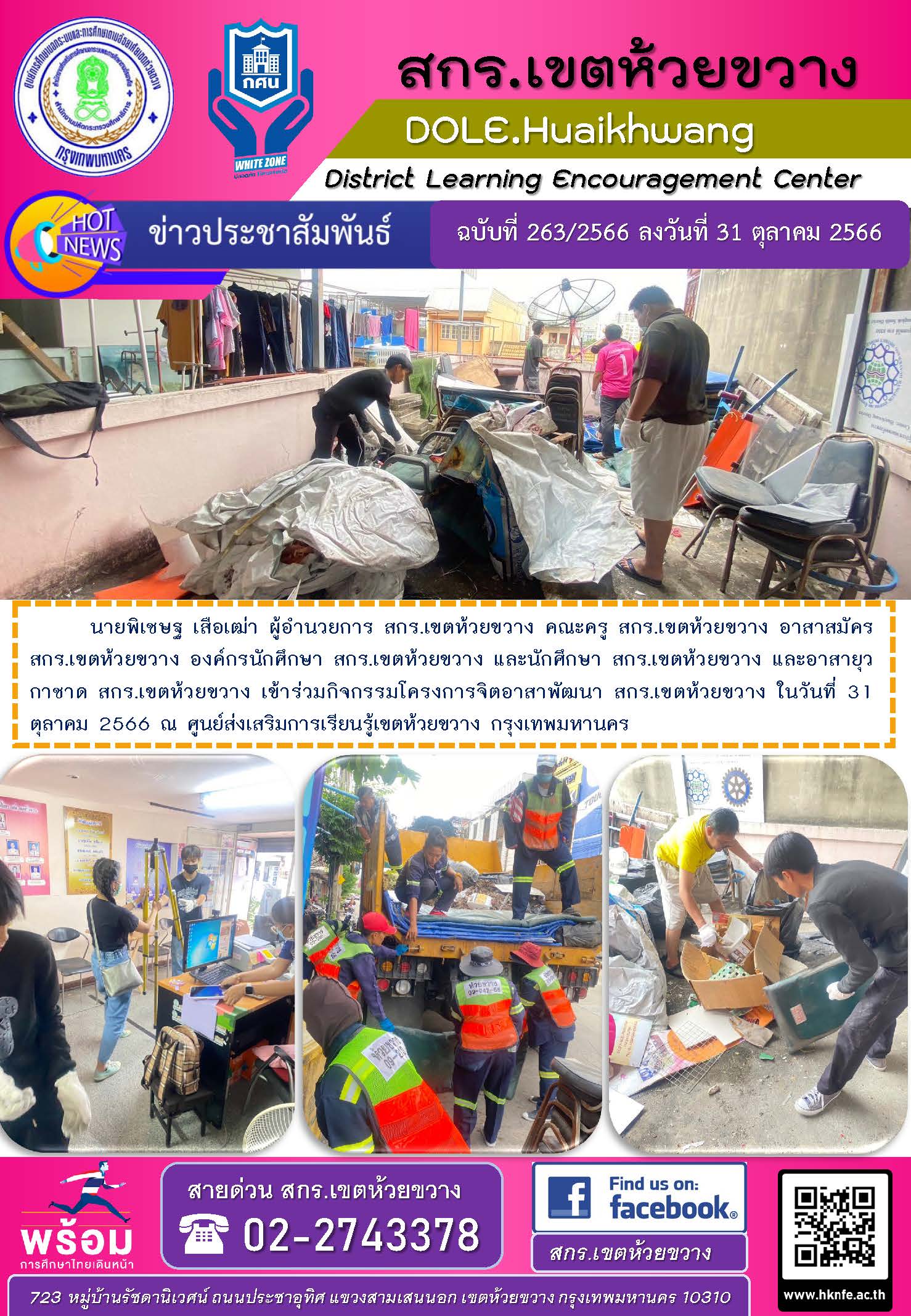 นายพิเชษฐ เสือเฒ่า ผู้อำนวยการ สกร.เขตห้วยขวาง คณะครู สกร.เขตห้วยขวาง อาสาสมัคร สกร.เขตห้วยขวาง องค์กรนักศึกษา สกร.เขตห้วยขวาง และนักศึกษา สกร.เขตห้วยขวาง และอาสายุวกาชาด สกร.เขตห้วยขวาง เข้าร่วมกิจกรรมโครงการจิตอาสาพัฒนา สกร.เขตห้วยขวาง ในวันที่ 31 ตุลาคม 2566 ณ ศูนย์ส่งเสริมการเรียนรู้เขตห้วยขวาง กรุงเทพมหานคร