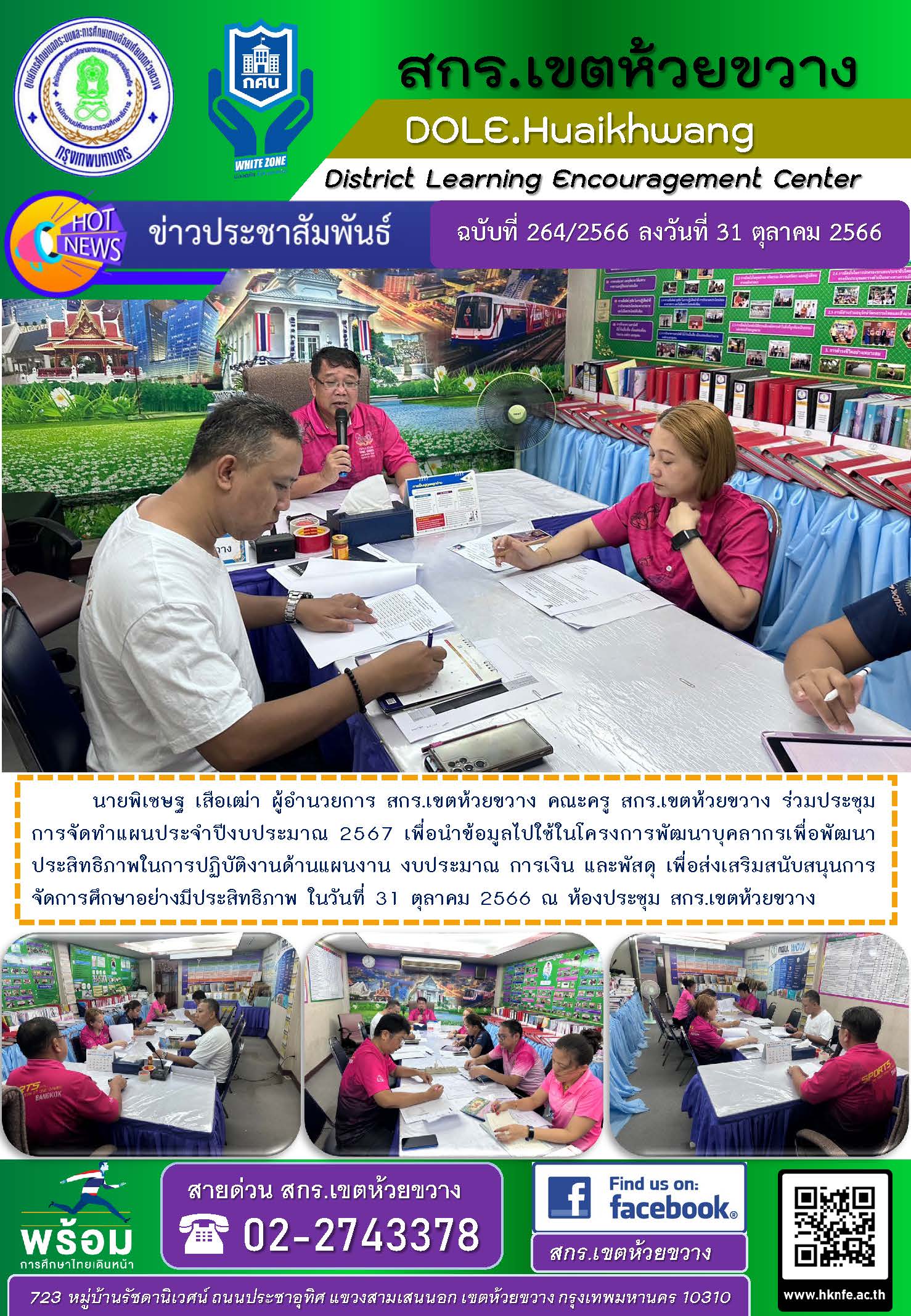 นายพิเชษฐ เสือเฒ่า ผู้อำนวยการ สกร.เขตห้วยขวาง คณะครู สกร.เขตห้วยขวาง ร่วมประชุมการจัดทำแผนประจำปีงบประมาณ 2567 เพื่อนำข้อมูลไปใช้ในโครงการพัฒนาบุคลากรเพื่อพัฒนาประสิทธิภาพในการปฏิบัติงานด้านแผนงาน งบประมาณ การเงิน และพัสดุ เพื่อส่งเสริมสนับสนุนการจัดการศึกษาอย่างมีประสิทธิภาพ ในวันที่ 31 ตุลาคม 2566 ณ ห้องประชุม สกร.เขตห้วยขวาง