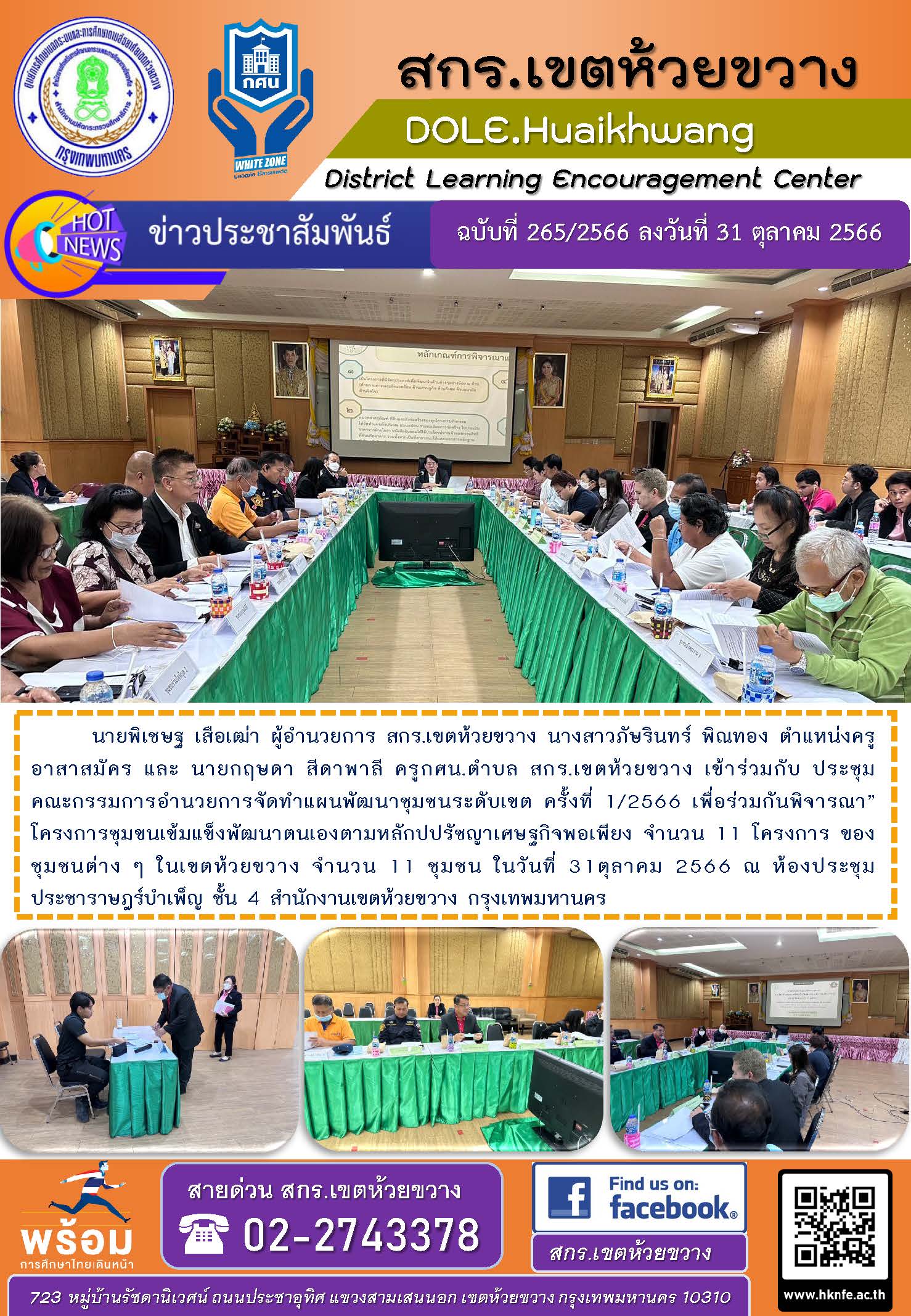 นายพิเชษฐ เสือเฒ่า ผู้อำนวยการ สกร.เขตห้วยขวาง นางสาวภัษรินทร์ พิณทอง ตำแหน่งครูอาสาสมัคร และ นายกฤษดา สีดาพาลี ครูกศน.ตำบล สกร.เขตห้วยขวาง เข้าร่วมกับ ประชุมคณะกรรมการอำนวยการจัดทำแผนพัฒนาชุมชนระดับเขต ครั้งที่ 1/2566 เพื่อร่วมกันพิจารณา”โครงการชุมขนเข้มแข็งพัฒนาตนเองตามหลักปปรัชญาเศษฐกิจพอเพียง จำนวน 11 โครงการ ของชุมชนต่าง ๆ ในเขตห้วยขวาง จำนวน 11 ชุมชน ในวันที่ 31ตุลาคม 2566 ณ ห้องประชุมประชาราษฎร์บำเพ็ญ ชั้น 4 สำนักงานเขตห้วยขวาง กรุงเทพมหานคร