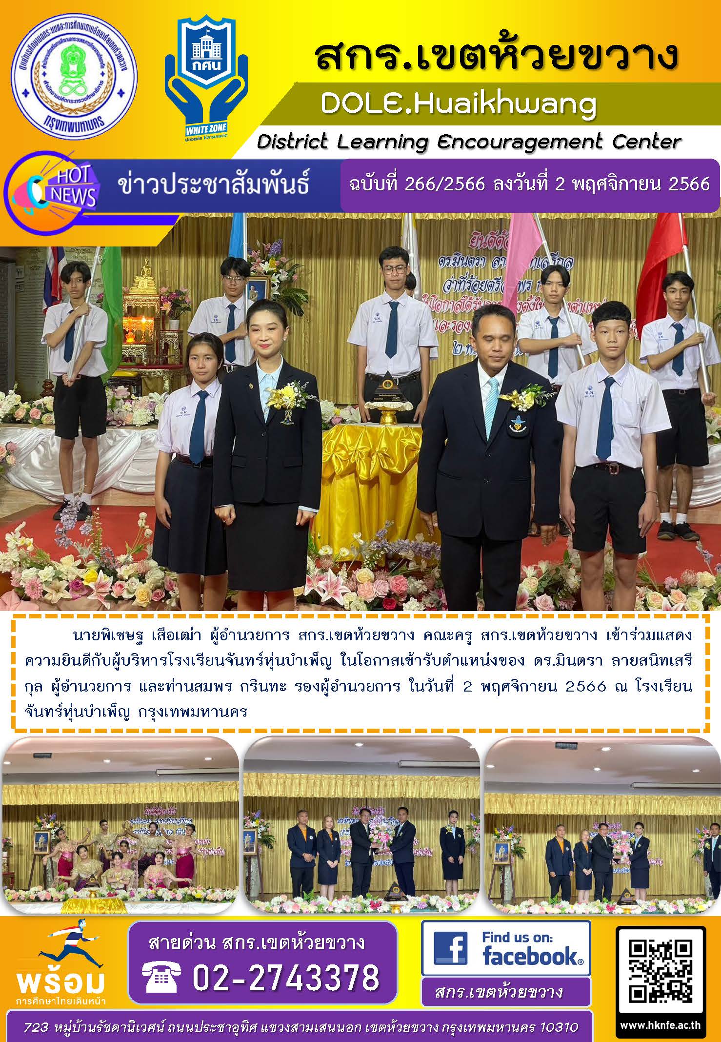 นายพิเชษฐ เสือเฒ่า ผู้อำนวยการ สกร.เขตห้วยขวาง คณะครู สกร.เขตห้วยขวาง เข้าร่วมแสดงความยินดีกับผู้บริหารโรงเรียนจันทร์หุ่นบำเพ็ญ ในโอกาสเข้ารับตำแหน่งของ ดร.มินตรา ลายสนิทเสรีกุล ผู้อำนวยการ และท่านสมพร กรินทะ รองผู้อำนวยการ ในวันที่ 2 พฤศจิกายน 2566 ณ โรงเรียนจันทร์หุ่นบำเพ็ญ กรุงเทพมหานคร