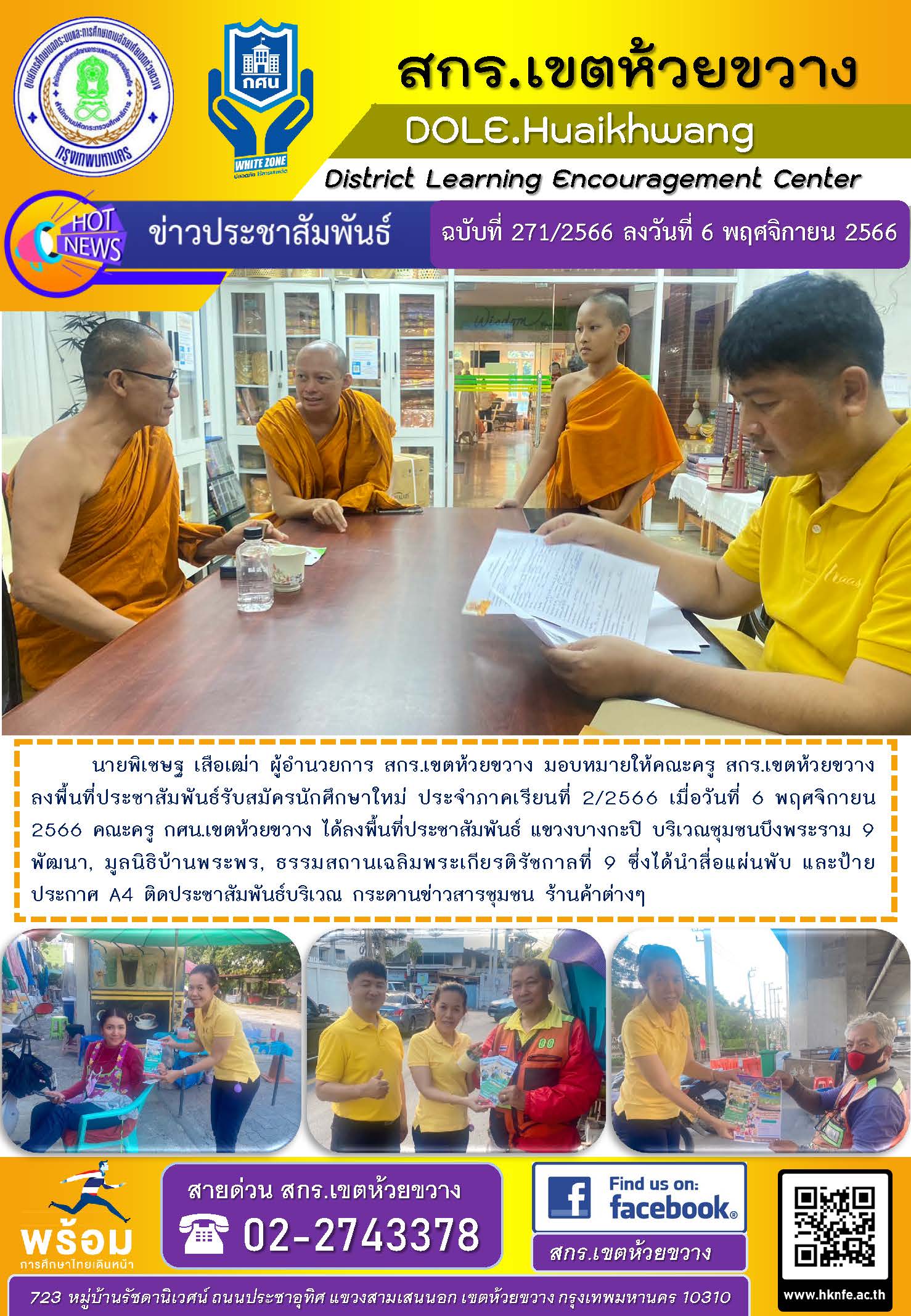 นายพิเชษฐ เสือเฒ่า ผู้อำนวยการ สกร.เขตห้วยขวาง มอบหมายให้คณะครู สกร.เขตห้วยขวาง ลงพื้นที่ประชาสัมพันธ์รับสมัครนักศึกษาใหม่ ประจำภาคเรียนที่ 2/2566 เมื่อวันที่ 6 พฤศจิกายน 2566 คณะครู กศน.เขตห้วยขวาง ได้ลงพื้นที่ประชาสัมพันธ์ แขวงบางกะปิ บริเวณชุมชนบึงพระราม 9 พัฒนา, มูลนิธิบ้านพระพร, ธรรมสถานเฉลิมพระเกียรติรัชกาลที่ 9 ซึ่งได้นำสื่อแผ่นพับ และป้ายประกาศ A4 ติดประชาสัมพันธ์บริเวณ กระดานข่าวสารชุมชน ร้านค้าต่างๆ
