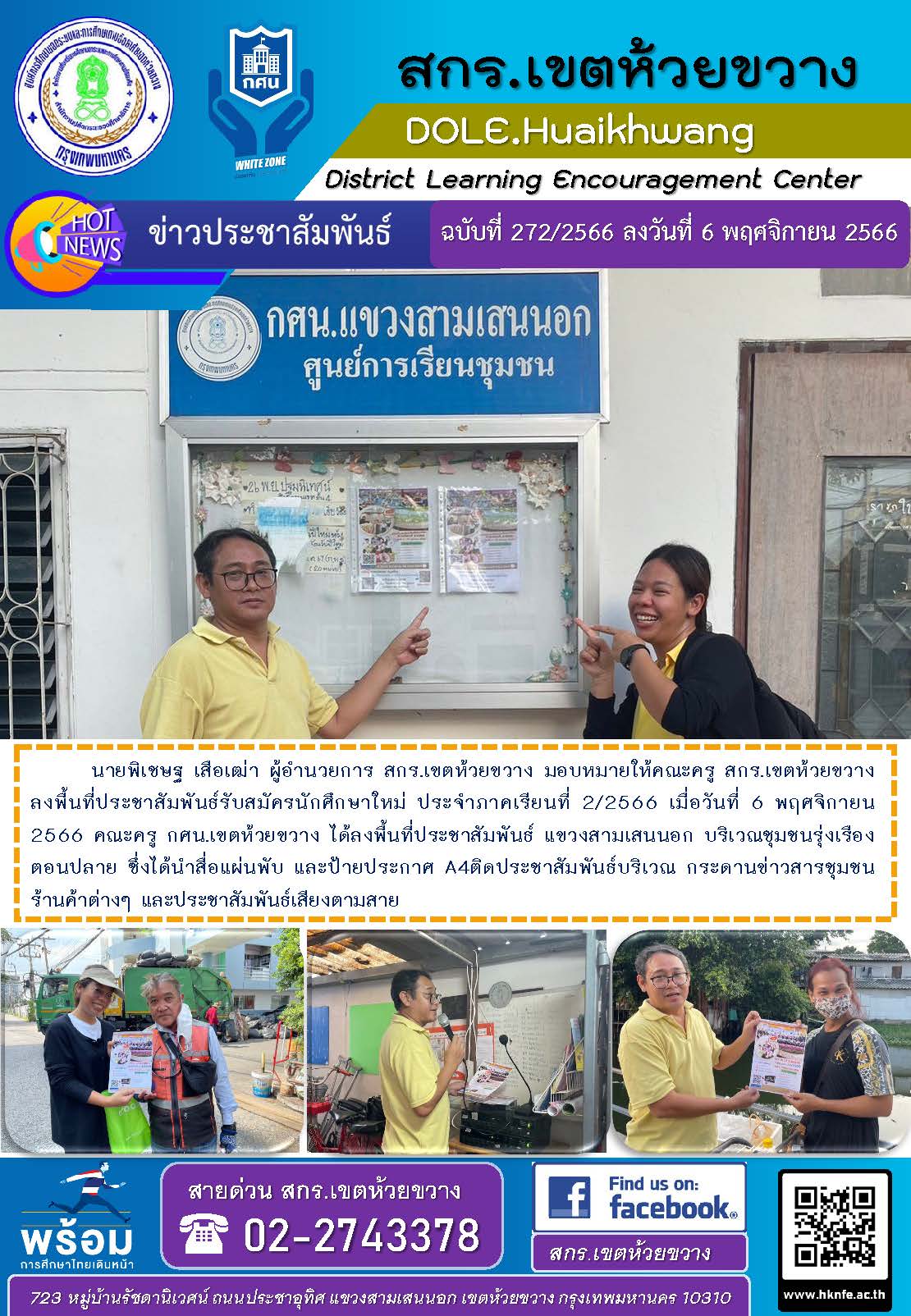 นายพิเชษฐ เสือเฒ่า ผู้อำนวยการ สกร.เขตห้วยขวาง มอบหมายให้คณะครู สกร.เขตห้วยขวาง ลงพื้นที่ประชาสัมพันธ์รับสมัครนักศึกษาใหม่ ประจำภาคเรียนที่ 2/2566 เมื่อวันที่ 6 พฤศจิกายน 2566 คณะครู กศน.เขตห้วยขวาง ได้ลงพื้นที่ประชาสัมพันธ์ แขวงสามเสนนอก บริเวณชุมชนรุ่งเรืองตอนปลาย ซึ่งได้นำสื่อแผ่นพับ และป้ายประกาศ A4 ติดประชาสัมพันธ์บริเวณ กระดานข่าวสารชุมชน ร้านค้าต่างๆ และประชาสัมพันธ์เสียงตามสาย