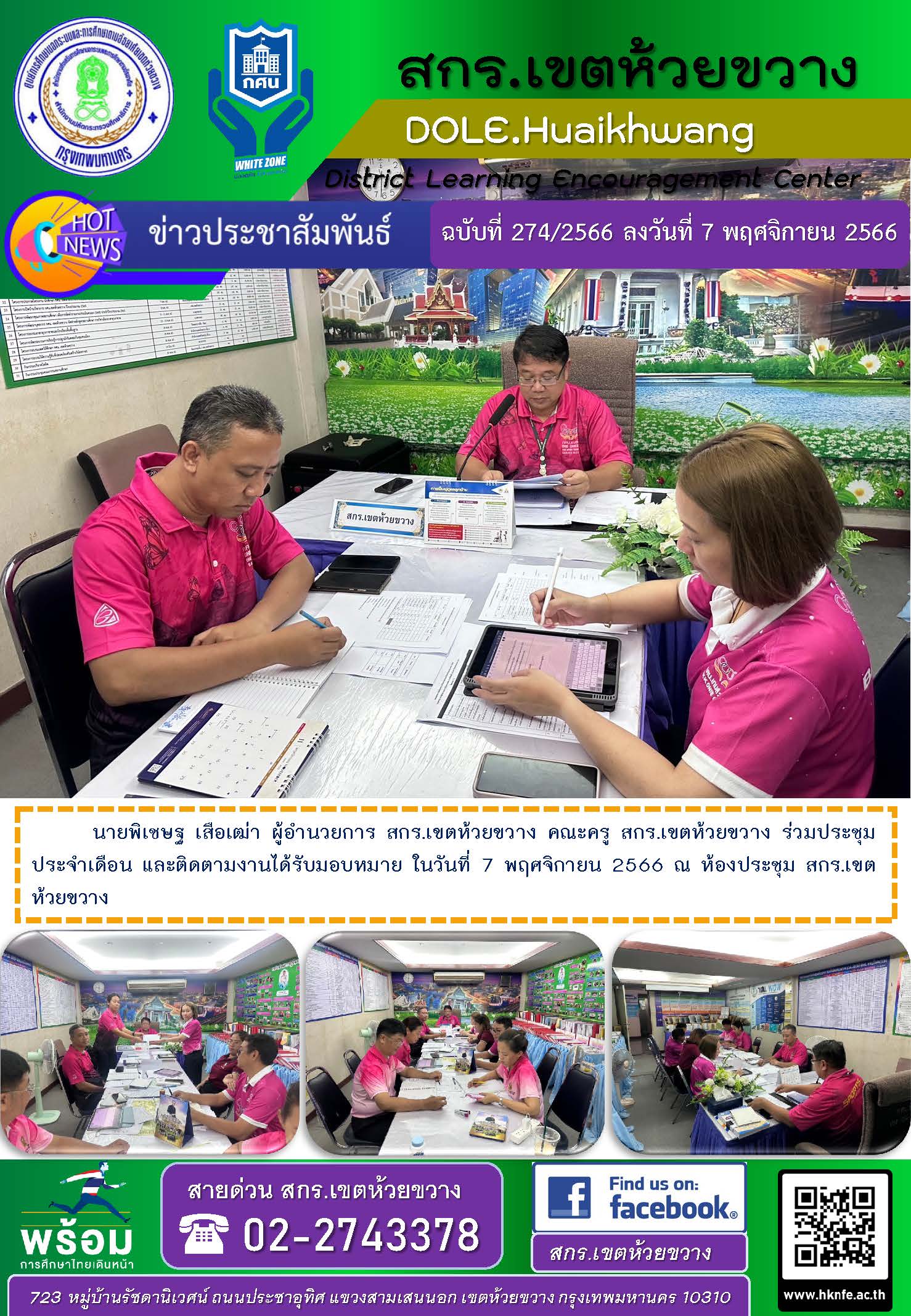 นายพิเชษฐ เสือเฒ่า ผู้อำนวยการ สกร.เขตห้วยขวาง คณะครู สกร.เขตห้วยขวาง ร่วมประชุมประจำเดือน และติดตามงานได้รับมอบหมาย ในวันที่ 7 พฤศจิกายน 2566 ณ ห้องประชุม สกร.เขตห้วยขวาง
