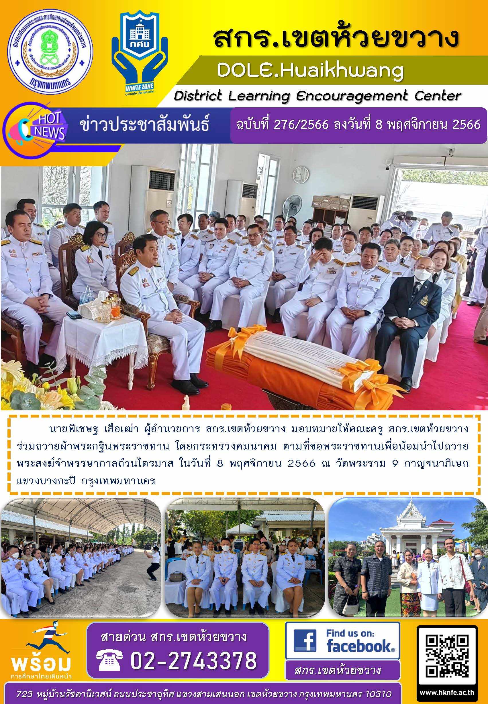 นายพิเชษฐ เสือเฒ่า ผู้อำนวยการ สกร.เขตห้วยขวาง มอบหมายให้คณะครู สกร.เขตห้วยขวาง ร่วมถวายผ้าพระกฐินพระราชทาน โดยกระทรวงคมนาคม ตามที่ขอพระราชทานเพื่อน้อมนำไปถวายพระสงฆ์จำพรรษากาลถ้วนไตรมาส ในวันที่ 8 พฤศจิกายน 2566 ณ วัดพระราม 9 กาญจนาภิเษก แขวงบางกะปิ กรุงเทพมหานคร