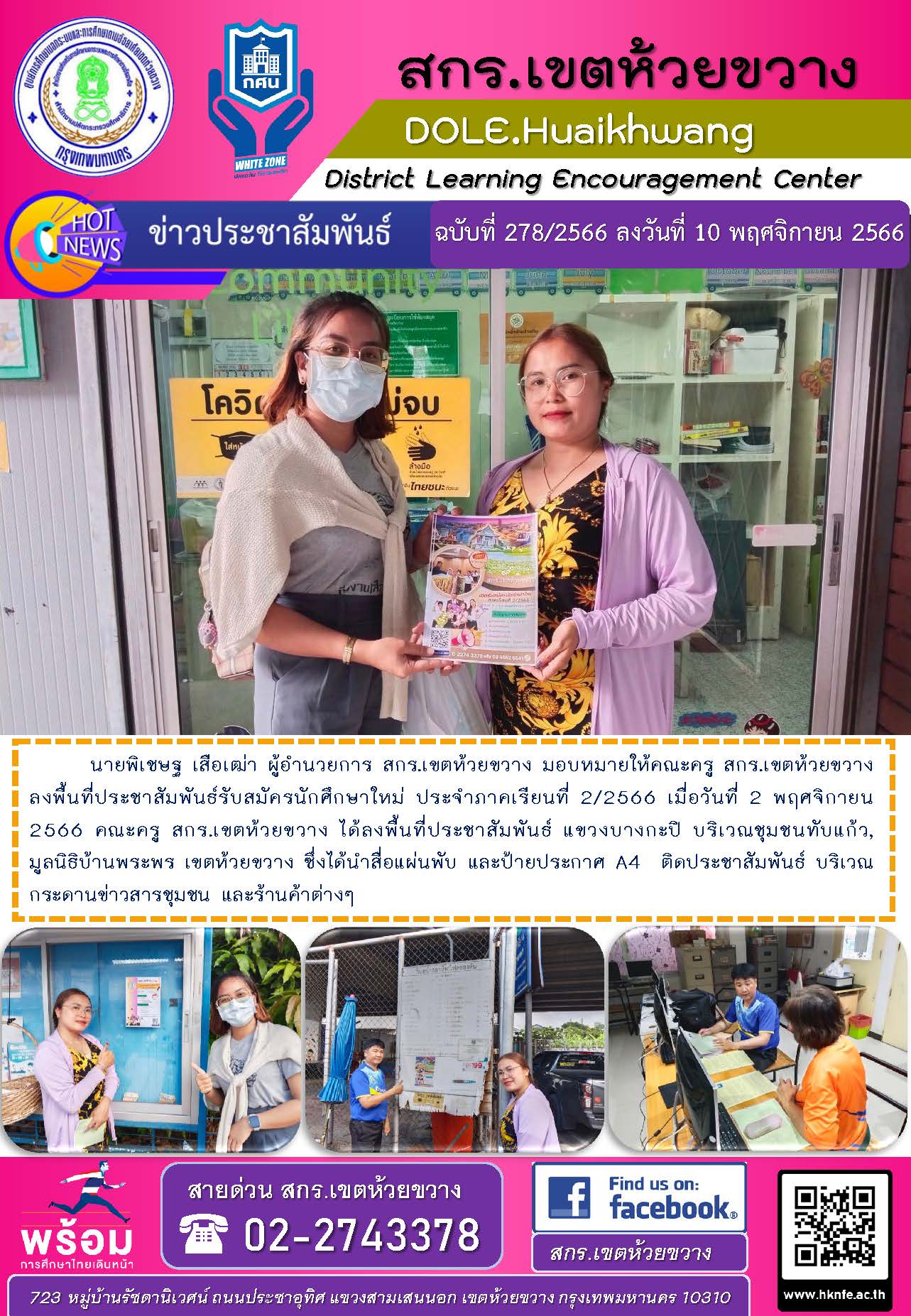 นายพิเชษฐ เสือเฒ่า ผู้อำนวยการ สกร.เขตห้วยขวาง มอบหมายให้คณะครู สกร.เขตห้วยขวาง ลงพื้นที่ประชาสัมพันธ์รับสมัครนักศึกษาใหม่ ประจำภาคเรียนที่ 2/2566 เมื่อวันที่ 2 พฤศจิกายน 2566 คณะครู สกร.เขตห้วยขวาง ได้ลงพื้นที่ประชาสัมพันธ์ แขวงบางกะปิ บริเวณชุมชนทับแก้ว, มูลนิธิบ้านพระพร เขตห้วยขวาง ซึ่งได้นำสื่อแผ่นพับ และป้ายประกาศ A4 ติดประชาสัมพันธ์ บริเวณ กระดานข่าวสารชุมชน และร้านค้าต่างๆ