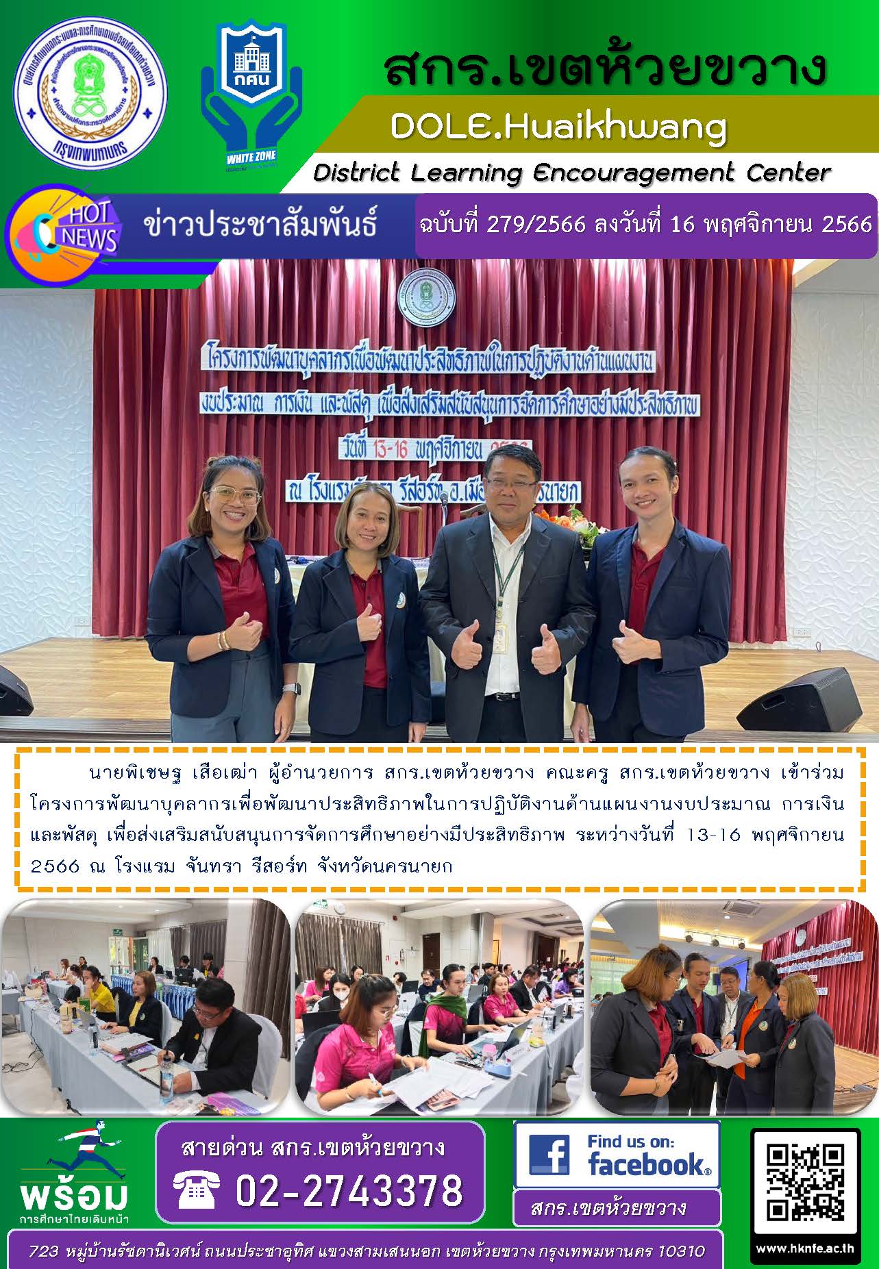 นายพิเชษฐ เสือเฒ่า ผู้อำนวยการ สกร.เขตห้วยขวาง คณะครู สกร.เขตห้วยขวาง เข้าร่วมโครงการพัฒนาบุคลากรเพื่อพัฒนาประสิทธิภาพในการปฏิบัติงานด้านแผนงานงบประมาณ การเงิน และพัสดุ เพื่อส่งเสริมสนับสนุนการจัดการศึกษาอย่างมีประสิทธิภาพ ระหว่างวันที่ 13-16 พฤศจิกายน 2566 ณ โรงแรม จันทรา รีสอร์ท จังหวัดนครนายก