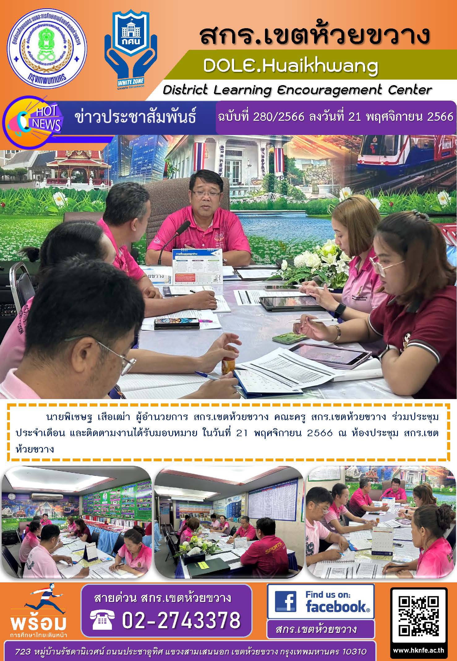 นายพิเชษฐ เสือเฒ่า ผู้อำนวยการ สกร.เขตห้วยขวาง คณะครู สกร.เขตห้วยขวาง ร่วมประชุมประจำเดือน และติดตามงานได้รับมอบหมาย ในวันที่ 21 พฤศจิกายน 2566 ณ ห้องประชุม สกร.เขตห้วยขวาง
