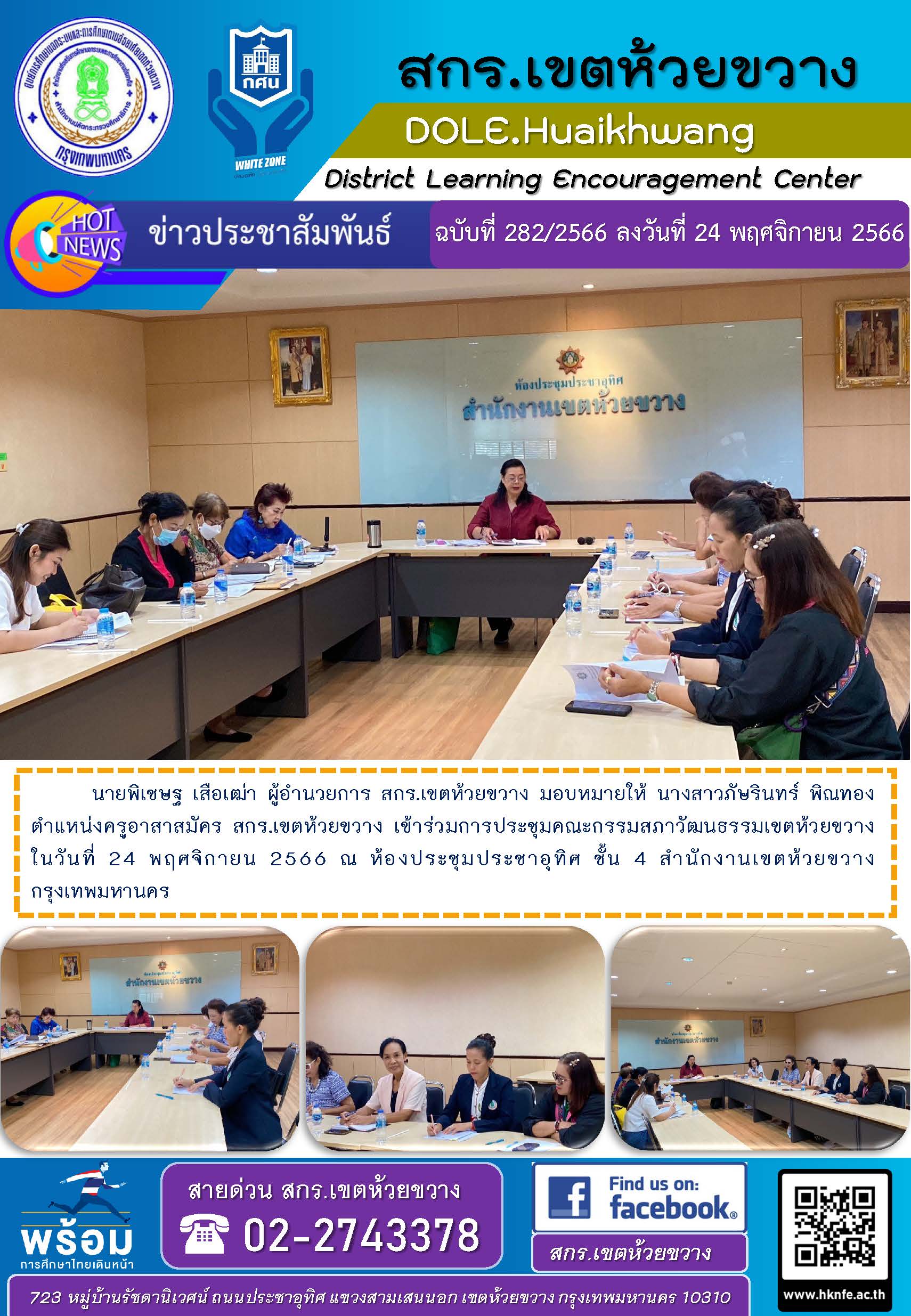 นายพิเชษฐ เสือเฒ่า ผู้อำนวยการ สกร.เขตห้วยขวาง มอบหมายให้ นางสาวภัษรินทร์ พิณทอง ตำแหน่งครูอาสาสมัคร สกร.เขตห้วยขวาง เข้าร่วมการประชุมคณะกรรมสภาวัฒนธรรมเขตห้วยขวาง ในวันที่ 24 พฤศจิกายน 2566 ณ ห้องประชุมประชาอุทิศ ชั้น 4 สำนักงานเขตห้วยขวาง กรุงเทพมหานคร