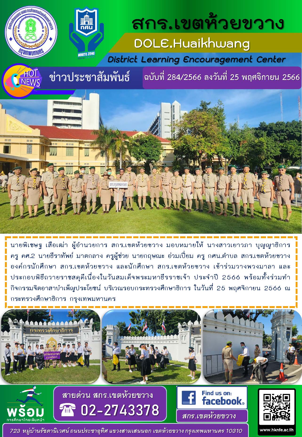 นายพิเชษฐ เสือเฒ่า ผู้อำนวยการ สกร.เขตห้วยขวาง มอบหมายให้ นางสาวเยาวภา บุญญาธิการ ครู คศ.2 นายธีราทัพย์ มาตกลาง ครูผู้ช่วย นายกฤษณะ อ่วมเปี่ยม ครู กศน.ตำบล สกร.เขตห้วยขวาง องค์กรนักศึกษา สกร.เขตห้วยขวาง และนักศึกษา สกร.เขตห้วยขวาง เข้าร่วมวางพวงมาลา และประกอบพิธีถวายราชสดุดีเนื่องในวันสมเด็จพระมหาธีรราชเจ้า ประจำปี 2566 พร้อมทั้งร่วมทำกิจกรรมจิตอาสาบำเพ็ญประโยชน์ บริเวณรอบกระทรวงศึกษาธิการ ในวันที่ 25 พฤศจิกายน 2566 ณ กระทรวงศึกษาธิการ กรุงเทพมหานคร