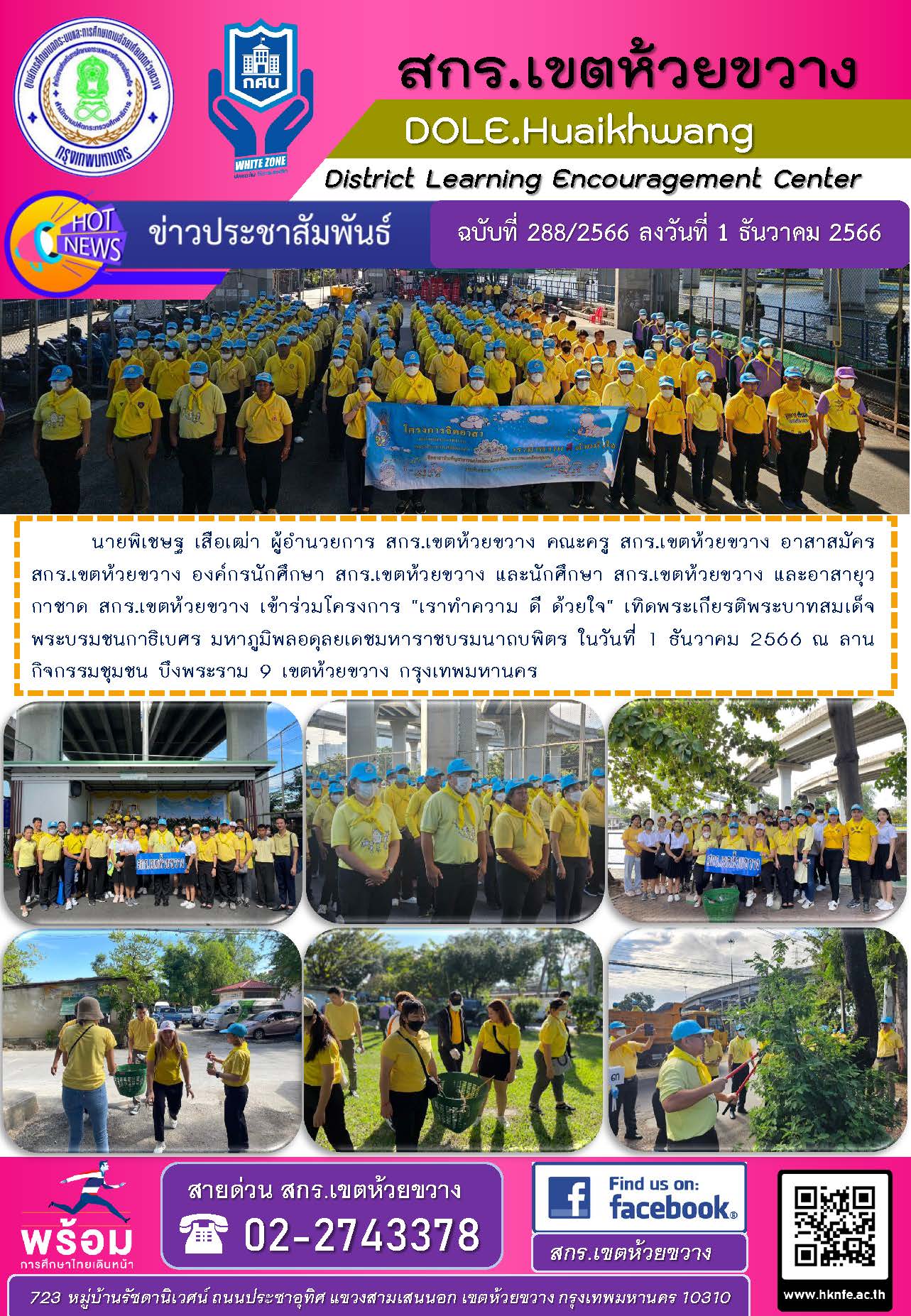 นายพิเชษฐ เสือเฒ่า ผู้อำนวยการ สกร.เขตห้วยขวาง คณะครู สกร.เขตห้วยขวาง อาสาสมัคร สกร.เขตห้วยขวาง องค์กรนักศึกษา สกร.เขตห้วยขวาง และนักศึกษา สกร.เขตห้วยขวาง และอาสายุวกาชาด สกร.เขตห้วยขวาง เข้าร่วมโครงการ "เราทำความ ดี ด้วยใจ" เทิดพระเกียรติพระบาทสมเด็จพระบรมชนกาธิเบศร มหาภูมิพลอดุลยเดชมหาราชบรมนาถบพิตร ในวันที่ 1 ธันวาคม 2566 ณ ลานกิจกรรมชุมชน บึงพระราม 9 เขตห้วยขวาง กรุงเทพมหานคร