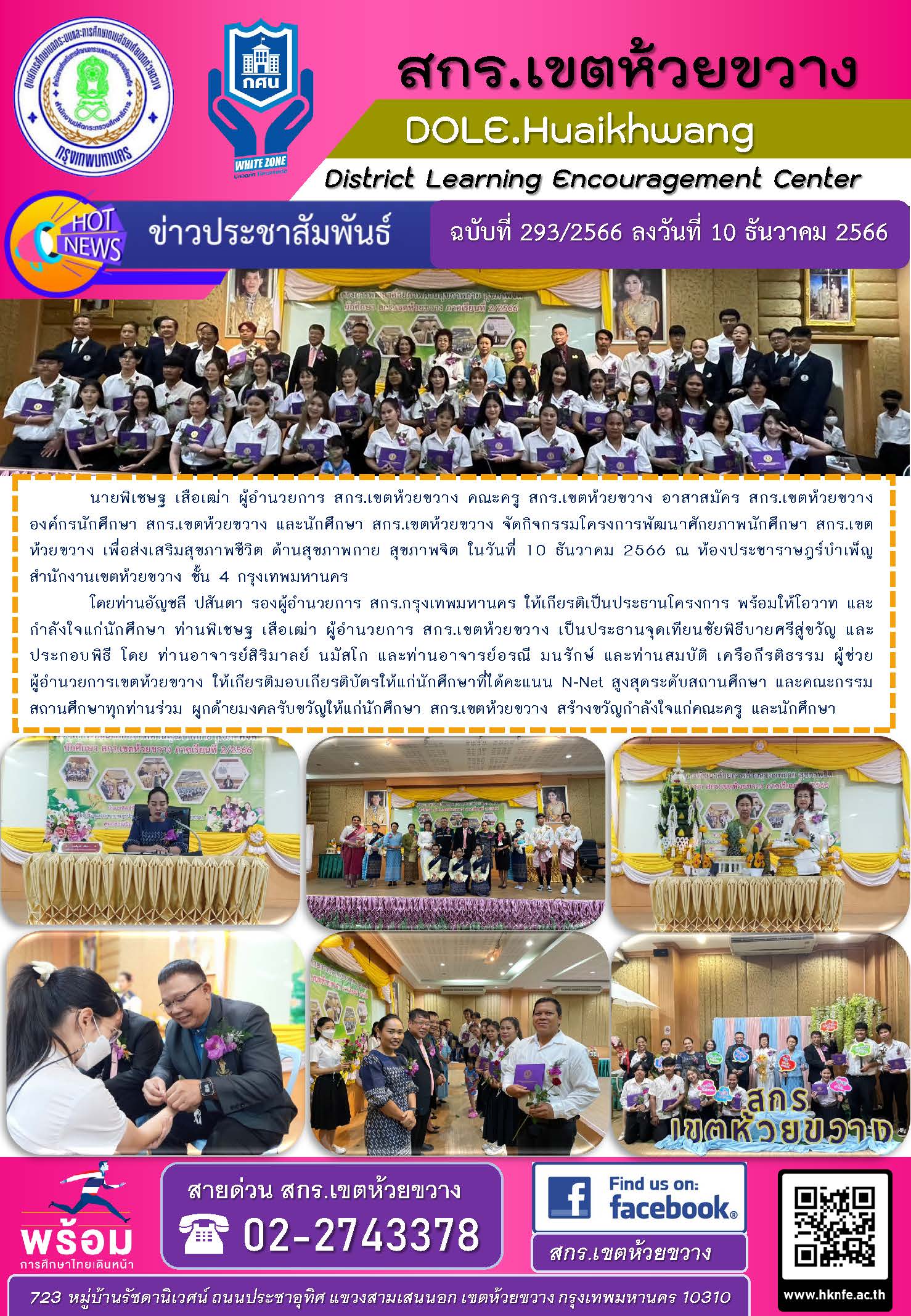 นายพิเชษฐ เสือเฒ่า ผู้อำนวยการ สกร.เขตห้วยขวาง คณะครู สกร.เขตห้วยขวาง อาสาสมัคร สกร.เขตห้วยขวาง องค์กรนักศึกษา สกร.เขตห้วยขวาง และนักศึกษา สกร.เขตห้วยขวาง จัดกิจกรรมโครงการพัฒนาศักยภาพนักศึกษา สกร.เขตห้วยขวาง เพื่อส่งเสริมสุขภาพชีวิต ด้านสุขภาพกาย สุขภาพจิต ในวันที่ 10 ธันวาคม 2566 ณ ห้องประชาราษฎร์บำเพ็ญ สำนักงานเขตห้วยขวาง ชั้น 4 กรุงเทพมหานคร