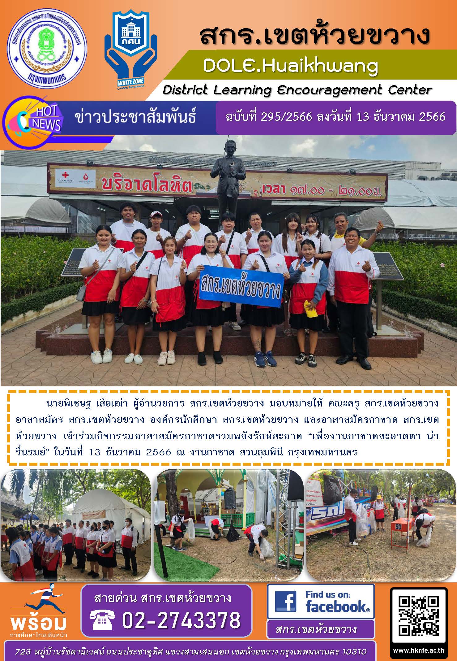 นายพิเชษฐ เสือเฒ่า ผู้อำนวยการ สกร.เขตห้วยขวาง มอบหมายให้ คณะครู สกร.เขตห้วยขวาง อาสาสมัคร สกร.เขตห้วยขวาง องค์กรนักศึกษา สกร.เขตห้วยขวาง และอาสาสมัครกาชาด สกร.เขตห้วยขวาง เข้าร่วมกิจกรรมอาสาสมัครกาชาดรวมพลังรักษ์สะอาด “เพื่องานกาชาดสะอาดตา น่ารื่นรมย์” ในวันที่ 13 ธันวาคม 2566 ณ งานกาชาด สวนลุมพินี กรุงเทพมหานคร