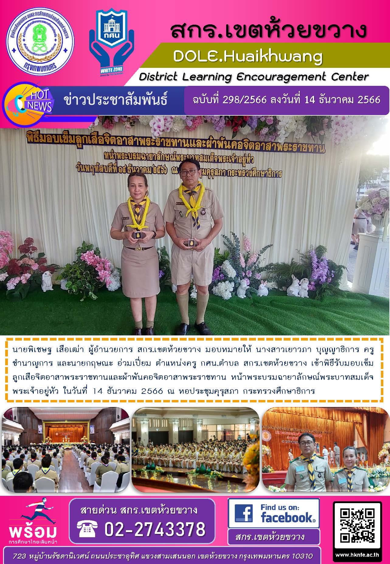 นายพิเชษฐ เสือเฒ่า ผู้อำนวยการ สกร.เขตห้วยขวาง มอบหมายให้ นางสาวเยาวภา บุญญาธิการ ครูชำนาญการ และนายกฤษณะ อ่วมเปี่ยม ตำแหน่งครู กศน.ตำบล สกร.เขตห้วยขวาง เข้าพิธีรับมอบเข็มลูกเสือจิตอาสาพระราชทานและผ้าพันคอจิตอาสาพระราชทาน หน้าพระบรมฉายาลักษณ์พระบาทสมเด็จพระเจ้าอยู่หัว ในวันที่ 14 ธันวาคม 2566 ณ หอประชุมคุรุสภา กระทรวงศึกษาธิการ