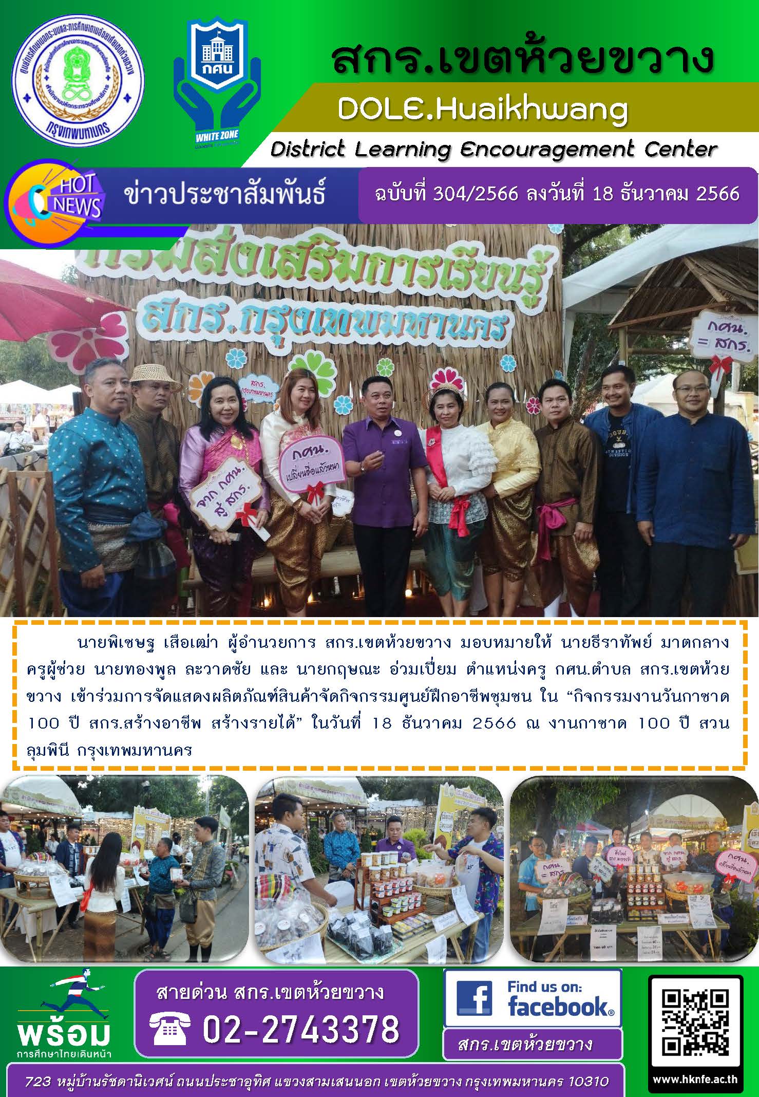 นายพิเชษฐ เสือเฒ่า ผู้อำนวยการ สกร.เขตห้วยขวาง มอบหมายให้ นายธีราทัพย์ มาตกลาง ครูผู้ช่วย นายทองพูล ละวาดชัย และ นายกฤษณะ อ่วมเปี่ยม ตำแหน่งครู กศน.ตำบล สกร.เขตห้วยขวาง เข้าร่วมการจัดแสดงผลิตภัณฑ์สินค้าจัดกิจกรรมศูนย์ฝึกอาชีพชุมชน ใน “กิจกรรมงานวันกาชาด 100 ปี สกร.สร้างอาชีพ สร้างรายได้” ในวันที่ 18 ธันวาคม 2566 ณ งานกาชาด 100 ปี สวนลุมพินี กรุงเทพมหานคร