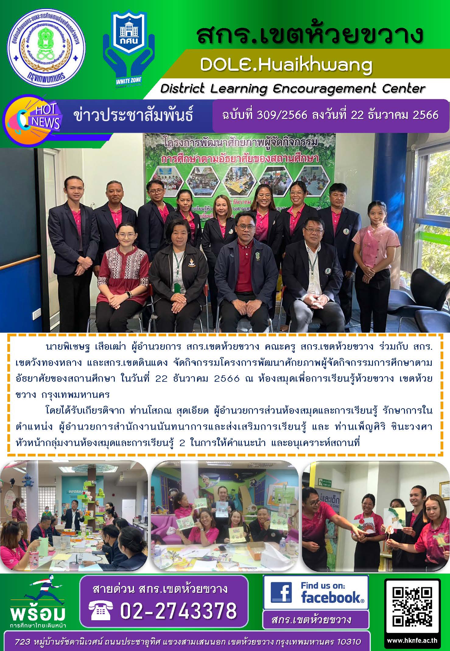 นายพิเชษฐ เสือเฒ่า ผู้อำนวยการ สกร.เขตห้วยขวาง คณะครู สกร.เขตห้วยขวาง ร่วมกับ สกร.เขตวังทองหลาง และสกร.เขตดินแดง จัดกิจกรรมโครงการพัฒนาศักยภาพผู้จัดกิจกรรมการศึกษาตามอัธยาศัยของสถานศึกษา ในวันที่ 22 ธันวาคม 2566 ณ ห้องสมุดเพื่อการเรียนรู้ห้วยขวาง เขตห้วยขวาง กรุงเทพมหานคร