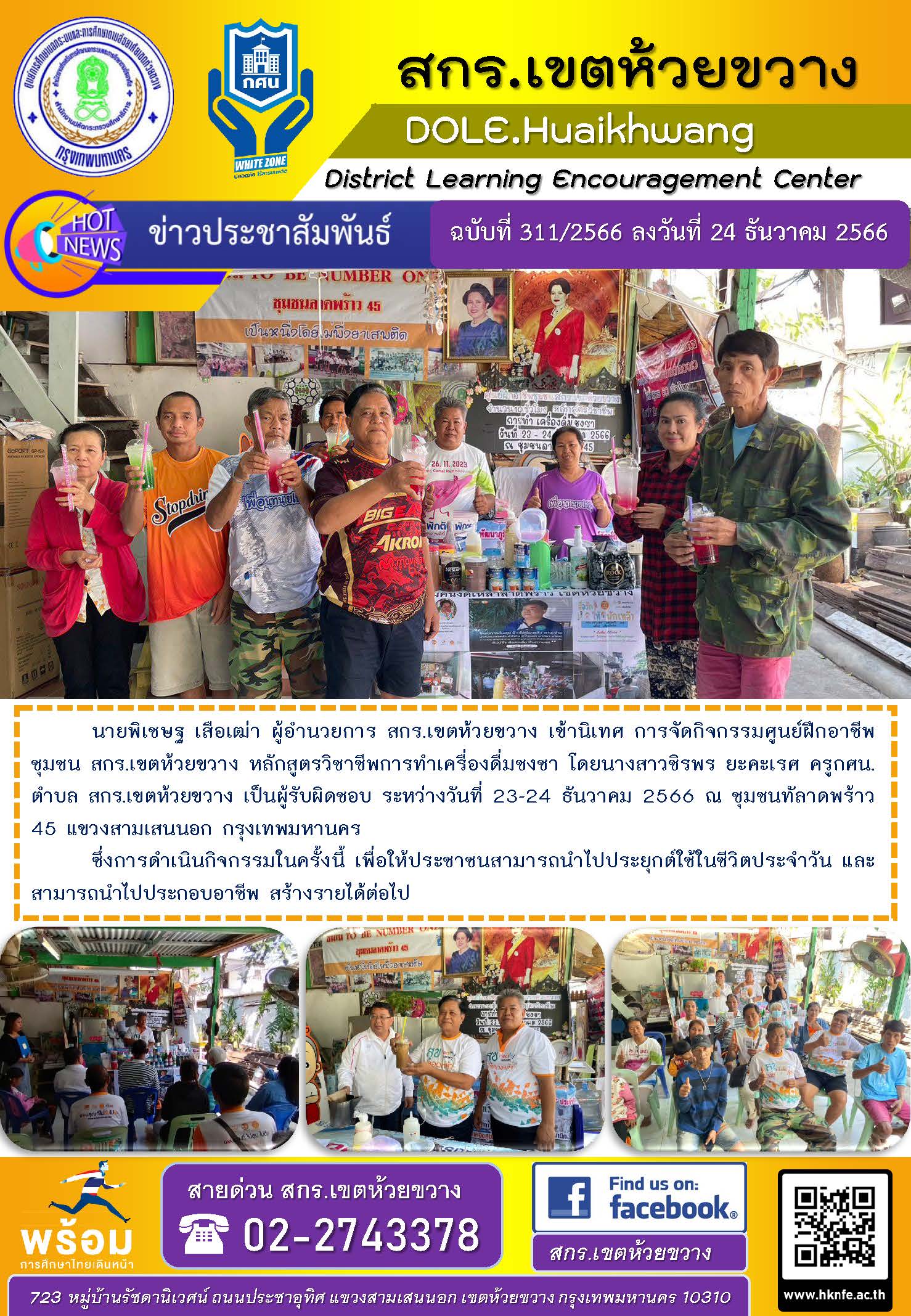 นายพิเชษฐ เสือเฒ่า ผู้อำนวยการ สกร.เขตห้วยขวาง เข้านิเทศ การจัดกิจกรรมศูนย์ฝึกอาชีพชุมชน สกร.เขตห้วยขวาง หลักสูตรวิชาชีพการทำเครื่องดื่มชงชา โดยนางสาวชิรพร ยะคะเรศ ครูกศน.ตำบล สกร.เขตห้วยขวาง เป็นผู้รับผิดชอบ ระหว่างวันที่ 23-24 ธันวาคม 2566 ณ ชุมชนทัลาดพร้าว 45 แขวงสามเสนนอก กรุงเทพมหานคร