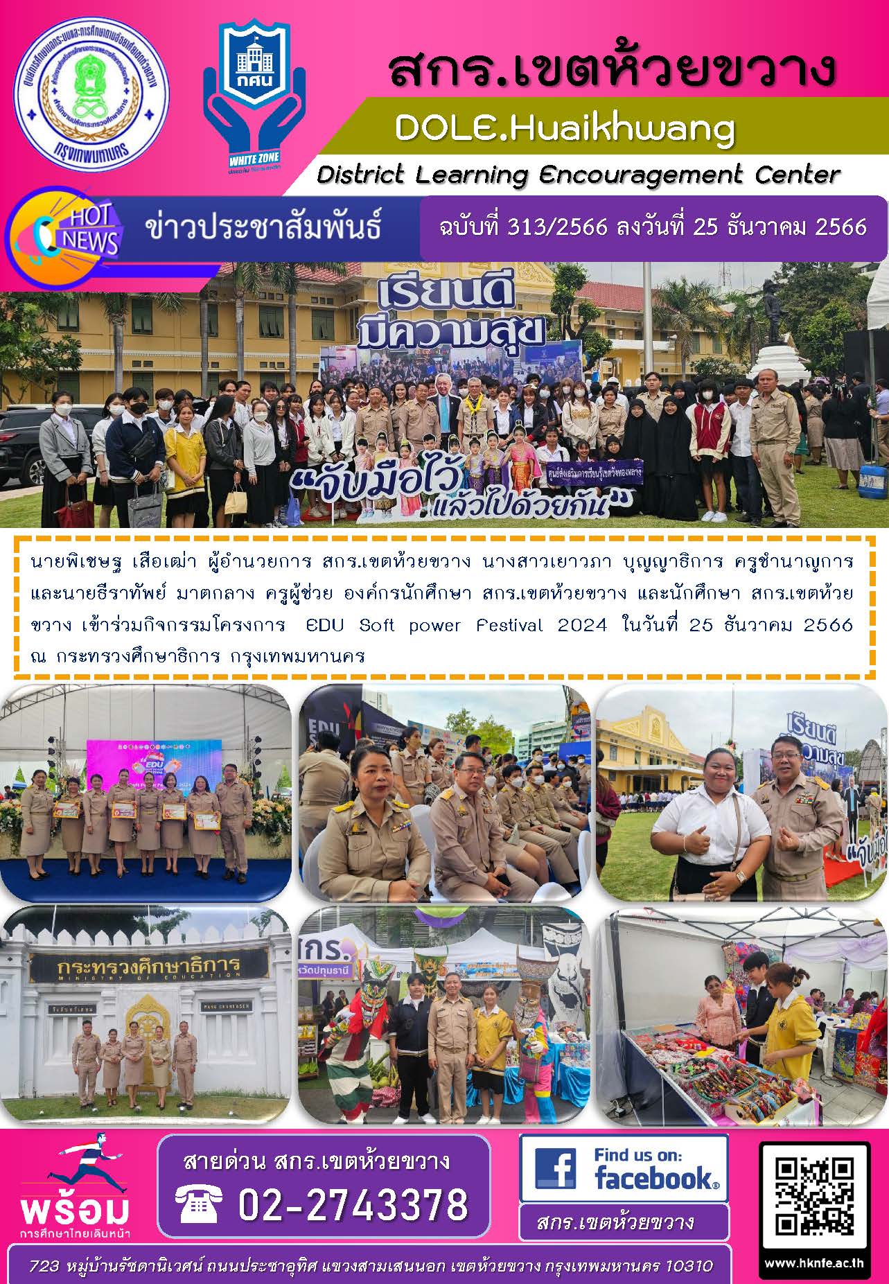 นายพิเชษฐ เสือเฒ่า ผู้อำนวยการ สกร.เขตห้วยขวาง นางสาวเยาวภา บุญญาธิการ ครูชำนาญการ และนายธีราทัพย์ มาตกลาง ครูผู้ช่วย องค์กรนักศึกษา สกร.เขตห้วยขวาง และนักศึกษา สกร.เขตห้วยขวาง เข้าร่วมกิจกรรมโครงการ EDU Soft power Festival 2024 ในวันที่ 25 ธันวาคม 2566 กระทรวงศึกษาธิการ กรุงเทพมหานคร
