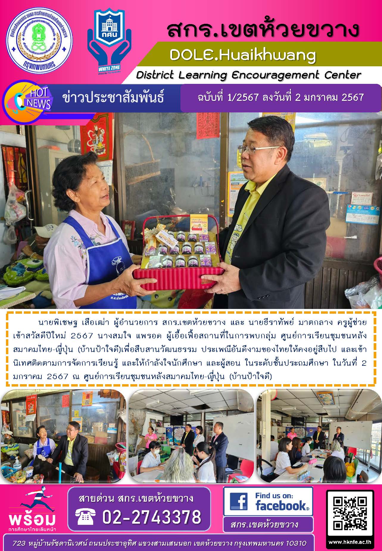 นายพิเชษฐ เสือเฒ่า ผู้อำนวยการ สกร.เขตห้วยขวาง และ นายธีราทัพย์ มาตกลาง ครูผู้ช่วย เข้าสวัสดีปีใหม่ 2567 นางสมใจ แพรอด ผู้เอื้อเฟื้อสถานที่ในการพบกลุ่ม ศูนย์การเรียนชุมชนหลังสมาคมไทย-ญี่ปุ่น (บ้านป้าใจดี)เพื่อสืบสานวัฒนธรรม ประเพณีอันดีงามของไทยให้คงอยู่สืบไป และเข้านิเทศติดตามการจัดการเรียนรู้ และให้กำลังใจนักศึกษา และผู้สอน ในระดับชั้นประถมศึกษา ในวันที่ 2 มกราคม 2567 ณ ศูนย์การเรียนชุมชนหลังสมาคมไทย-ญี่ปุ่น (บ้านป้าใจดี)