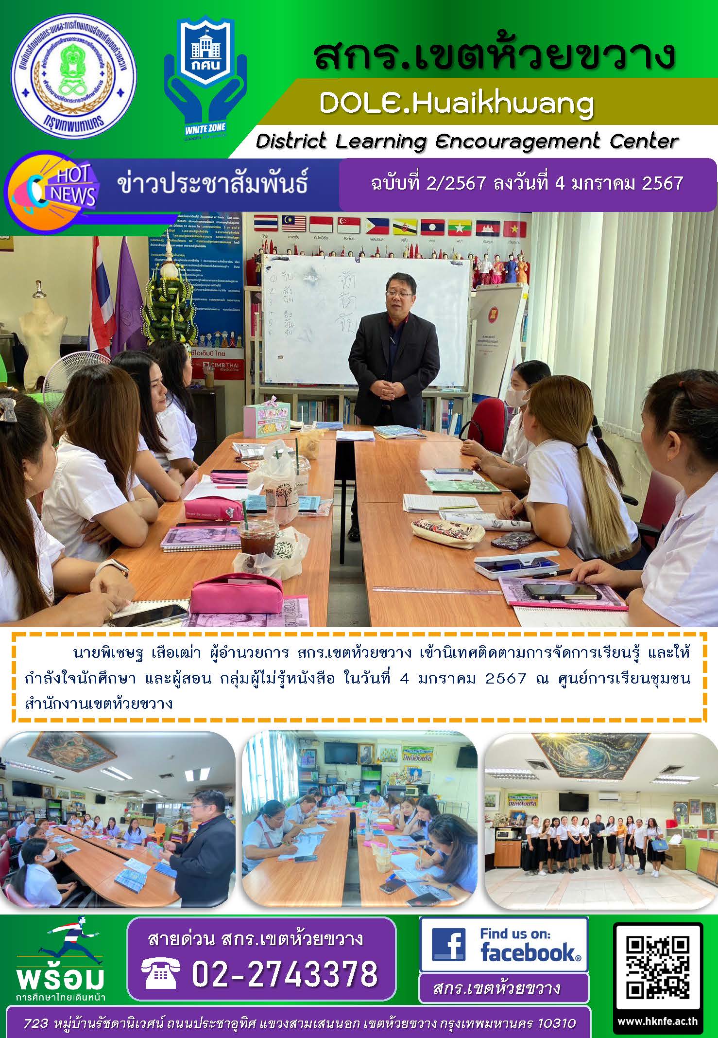นายพิเชษฐ เสือเฒ่า ผู้อำนวยการ สกร.เขตห้วยขวาง เข้านิเทศติดตามการจัดการเรียนรู้ และให้กำลังใจนักศึกษา และผู้สอน กลุ่มผู้ไม่รู้หนังสือ ในวันที่ 4 มกราคม 2567 ณ ศูนย์การเรียนชุมชนสำนักงานเขตห้วยขวาง