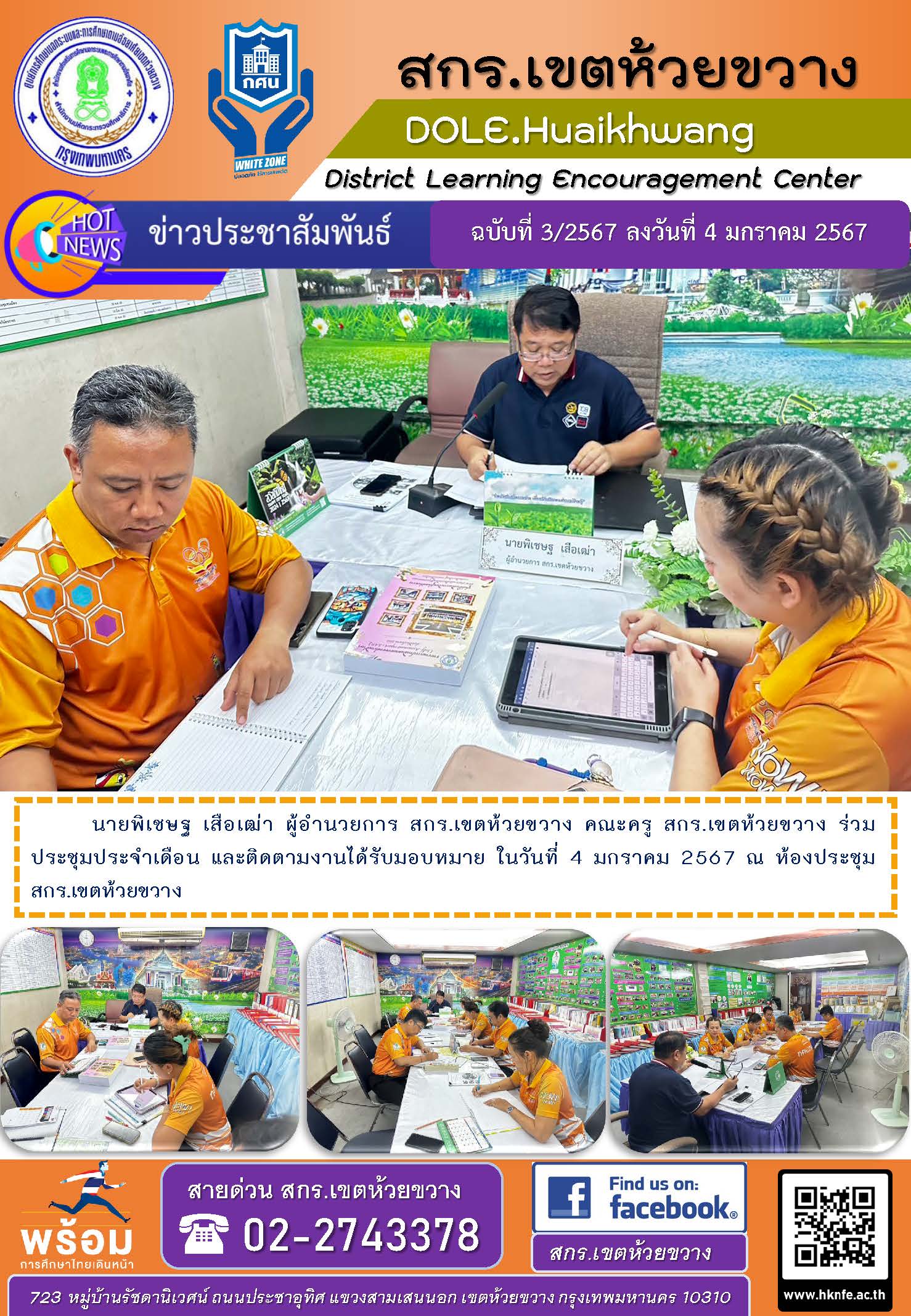 นายพิเชษฐ เสือเฒ่า ผู้อำนวยการ สกร.เขตห้วยขวาง คณะครู สกร.เขตห้วยขวาง ร่วมประชุมประจำเดือน และติดตามงานได้รับมอบหมาย ในวันที่ 4 มกราคม 2567 ณ ห้องประชุม สกร.เขตห้วยขวาง