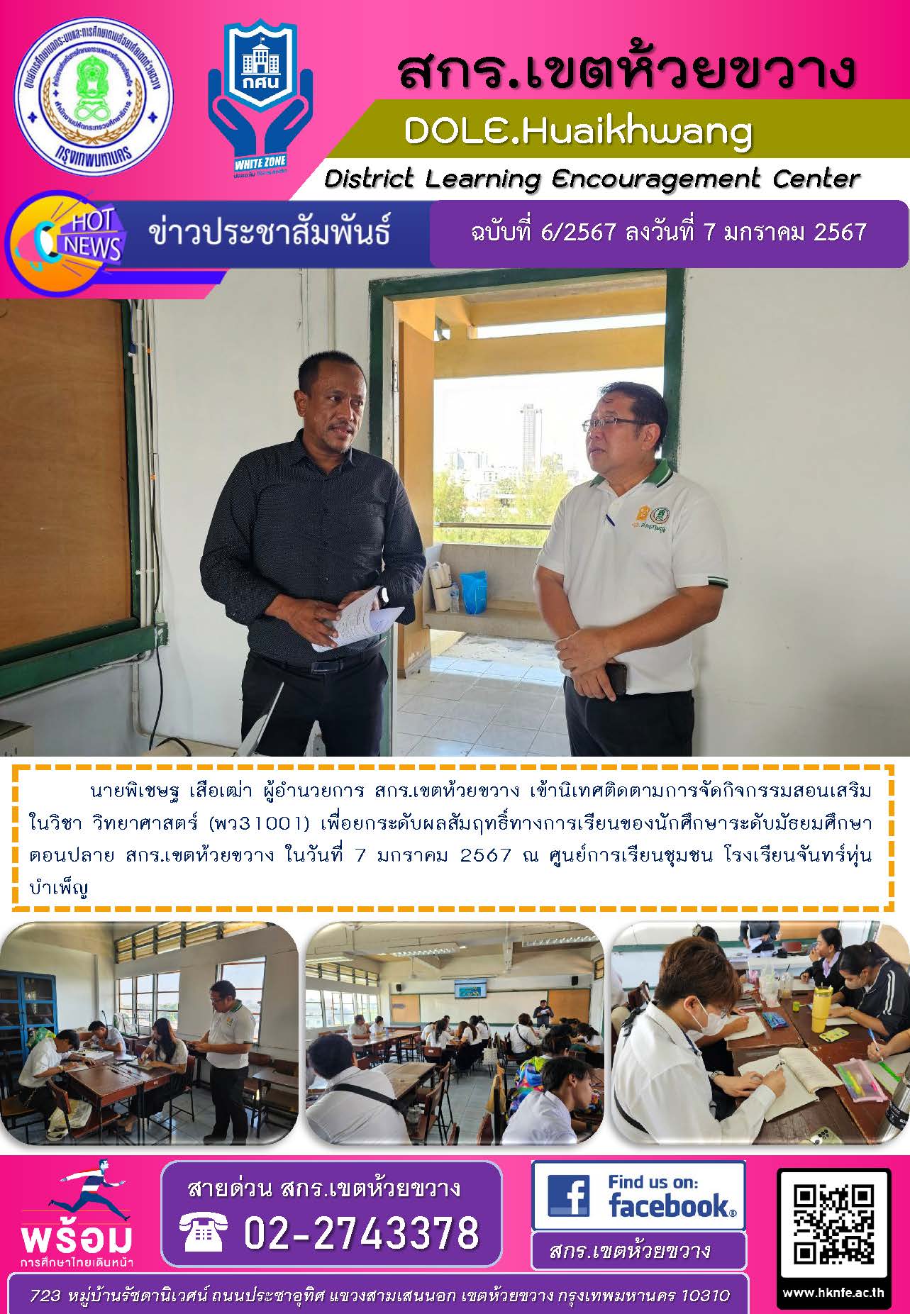 นายพิเชษฐ เสือเฒ่า ผู้อำนวยการ สกร.เขตห้วยขวาง เข้านิเทศติดตามการจัดกิจกรรมสอนเสริมในวิชา วิทยาศาสตร์ (พว31001) เพื่อยกระดับผลสัมฤทธิ์ทางการเรียนของนักศึกษาระดับมัธยมศึกษาตอนปลาย สกร.เขตห้วยขวาง ในวันที่ 7 มกราคม 2567 ณ ศูนย์การเรียนชุมชน โรงเรียนจันทร์หุ่นบำเพ็ญ