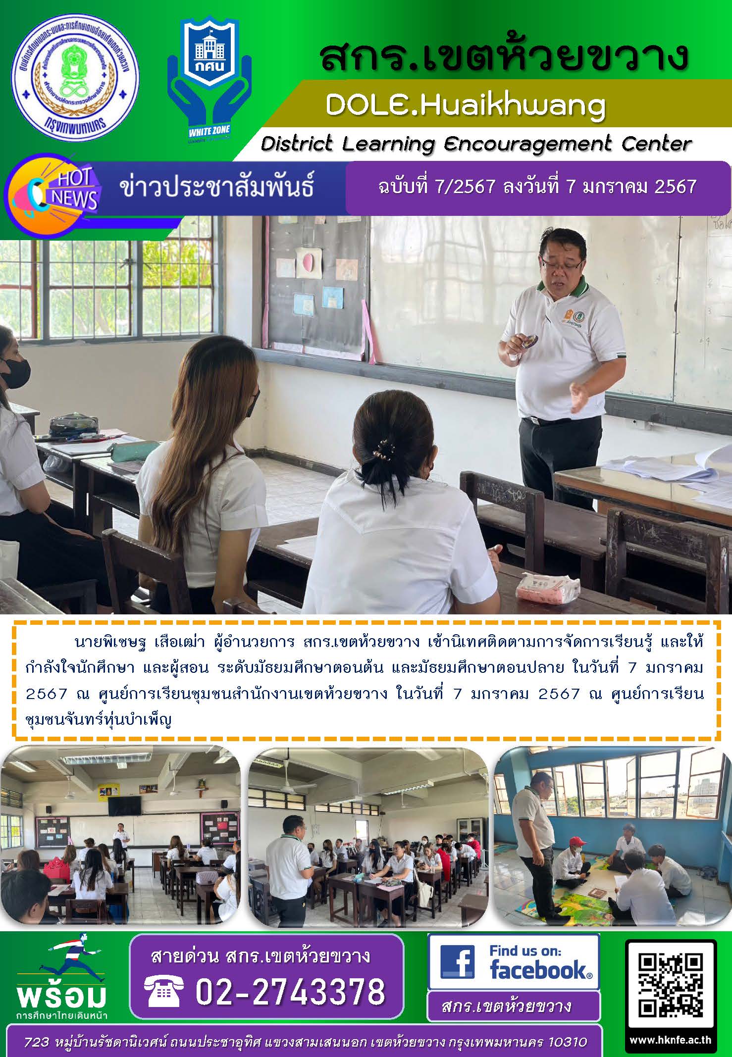 นายพิเชษฐ เสือเฒ่า ผู้อำนวยการ สกร.เขตห้วยขวาง เข้านิเทศติดตามการจัดการเรียนรู้ และให้กำลังใจนักศึกษา และผู้สอน ระดับมัธยมศึกษาตอนต้น และมัธยมศึกษาตอนปลาย ในวันที่ 7 มกราคม 2567 ณ ศูนย์การเรียนชุมชนสำนักงานเขตห้วยขวาง ในวันที่ 7 มกราคม 2567 ณ ศูนย์การเรียนชุมชนจันทร์หุ่นบำเพ็ญ