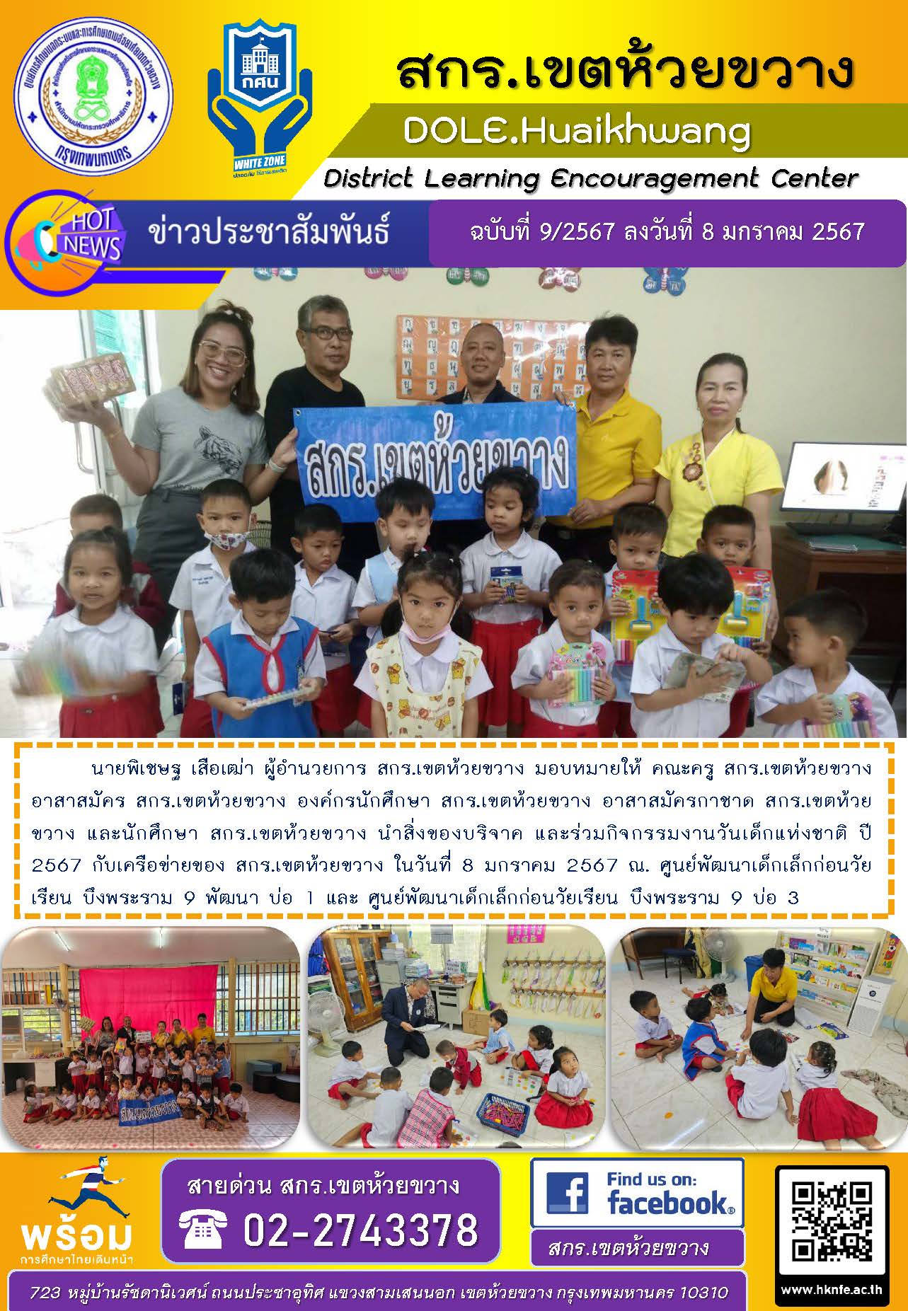 นายพิเชษฐ เสือเฒ่า ผู้อำนวยการ สกร.เขตห้วยขวาง มอบหมายให้ คณะครู สกร.เขตห้วยขวาง อาสาสมัคร สกร.เขตห้วยขวาง องค์กรนักศึกษา สกร.เขตห้วยขวาง อาสาสมัครกาชาด สกร.เขตห้วยขวาง และนักศึกษา สกร.เขตห้วยขวาง นำสิ่งของบริจาค และร่วมกิจกรรมงานวันเด็กแห่งชาติ ปี 2567 กับเครือข่ายของ สกร.เขตห้วยขวาง ในวันที่ 8 มกราคม 2567 ณ. ศูนย์พัฒนาเด็กเล็กก่อนวัยเรียน บึงพระราม 9 พัฒนา บ่อ 1 และ ศูนย์พัฒนาเด็กเล็กก่อนวัยเรียน บึงพระราม 9 บ่อ 3