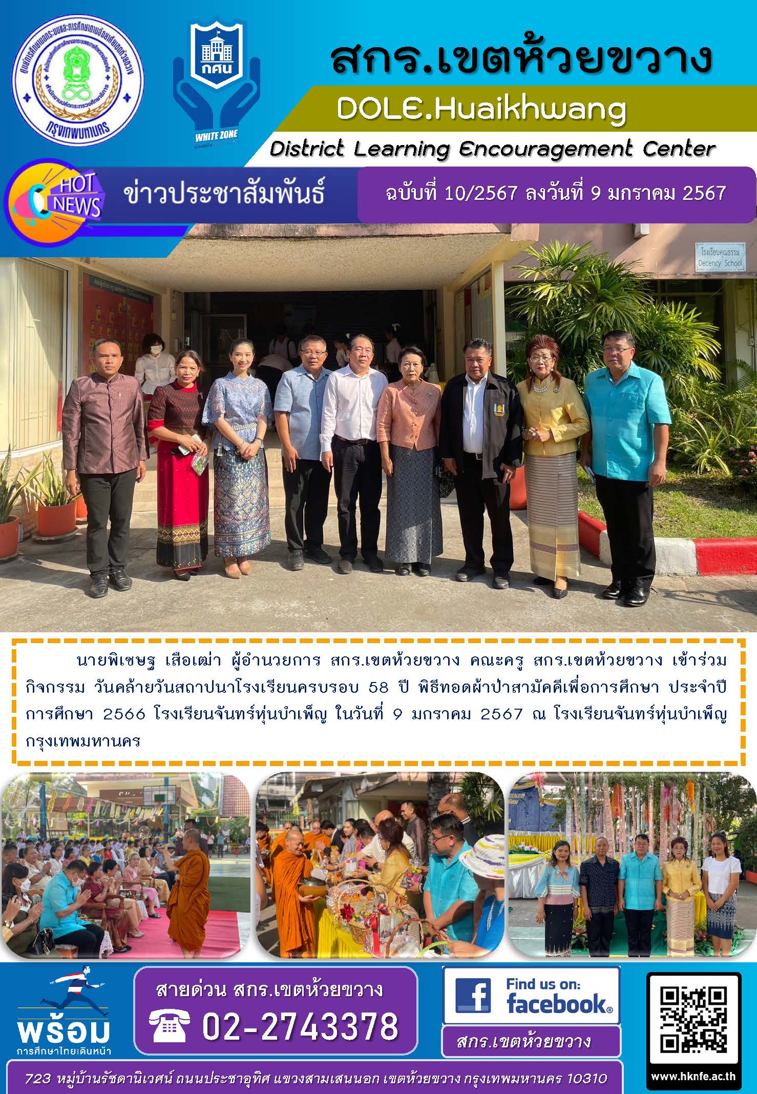 นายพิเชษฐ เสือเฒ่า ผู้อำนวยการ สกร.เขตห้วยขวาง คณะครู สกร.เขตห้วยขวาง เข้าร่วมกิจกรรม วันคล้ายวันสถาปนาโรงเรียนครบรอบ 58 ปี พิธีทอดผ้าป่าสามัคคีเพื่อการศึกษา ประจำปีการศึกษา 2566 โรงเรียนจันทร์หุ่นบำเพ็ญ ในวันที่ 9 มกราคม 2567 ณ โรงเรียนจันทร์หุ่นบำเพ็ญ กรุงเทพมหานคร