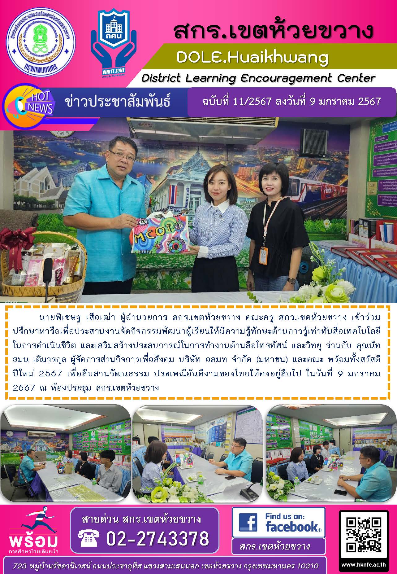 นายพิเชษฐ เสือเฒ่า ผู้อำนวยการ สกร.เขตห้วยขวาง คณะครู สกร.เขตห้วยขวาง เข้าร่วมปรึกษาหารือเพื่อประสานงานจัดกิจกรรมพัฒนาผู้เรียนให้มีความรู้ทักษะด้านการรู้เท่าทันสื่อเทคโนโลยี ในการดำเนินชีวิต และเสริมสร้างประสบการณ์ในการทำงานด้านสื่อโทรทัศน์ และวิทยุ ร่วมกับ คุณนัทธมน เติมวรกุล ผู้จัดการส่วนกิจการเพื่อสังคม บริษัท อสมท จำกัด (มหาชน) และคณะ พร้อมทั้งสวัสดีปีใหม่ 2567 เพื่อสืบสานวัฒนธรรม ประเพณีอันดีงามของไทยให้คงอยู่สืบไป ในวันที่ 9 มกราคม 2567 ณ ห้องประชุม สกร.เขตห้วยขวาง