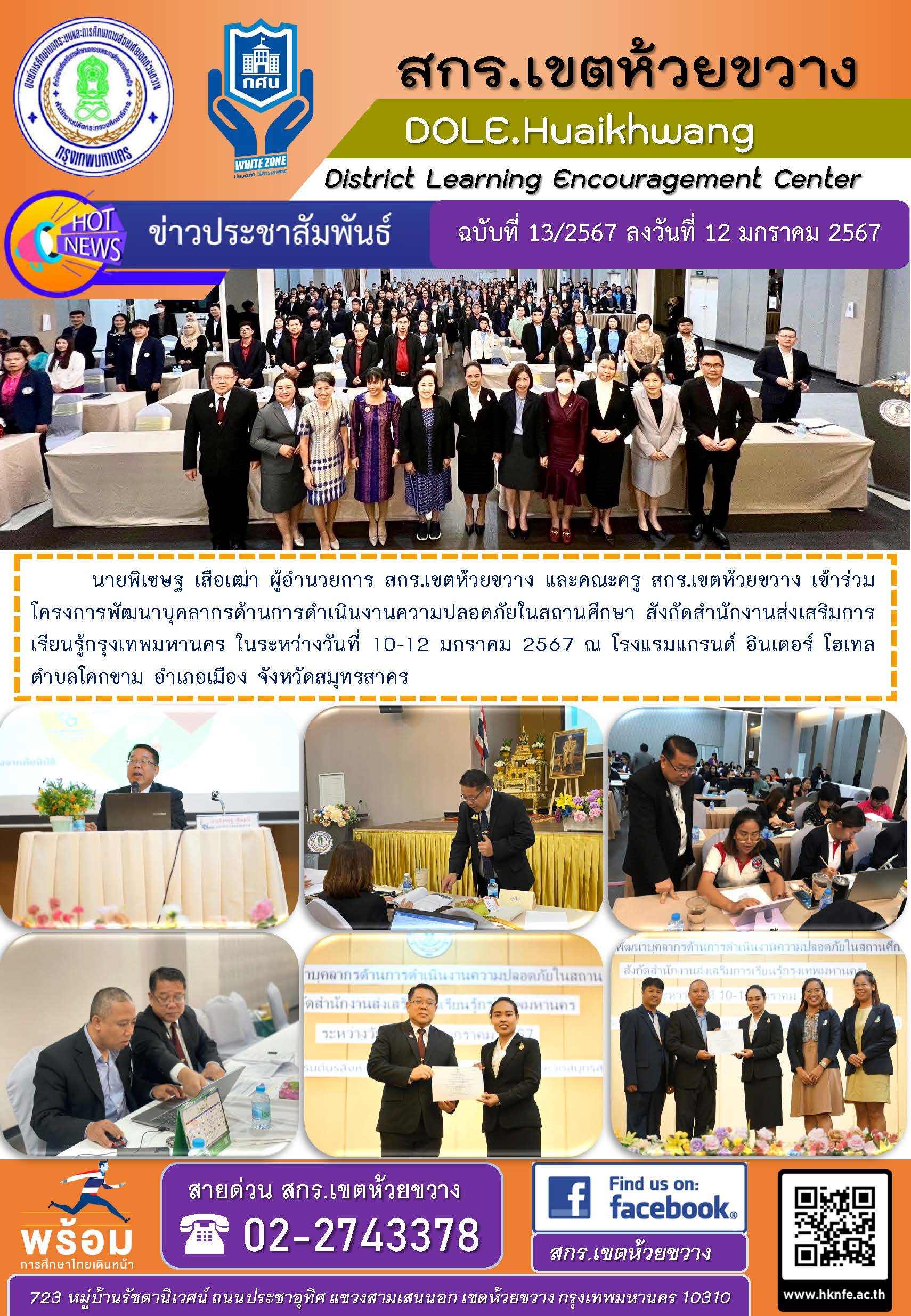 นายพิเชษฐ เสือเฒ่า ผู้อำนวยการ สกร.เขตห้วยขวาง และคณะครู สกร.เขตห้วยขวาง เข้าร่วมโครงการพัฒนาบุคลากรด้านการดำเนินงานความปลอดภัยในสถานศึกษา สังกัดสำนักงานส่งเสริมการเรียนรู้กรุงเทพมหานคร ในระหว่างวันที่ 10-12 มกราคม 2567 ณ โรงแรมแกรนด์ อินเตอร์ โฮเทล ตำบลโคกขาม อำเภอเมือง จังหวัดสมุทรสาคร