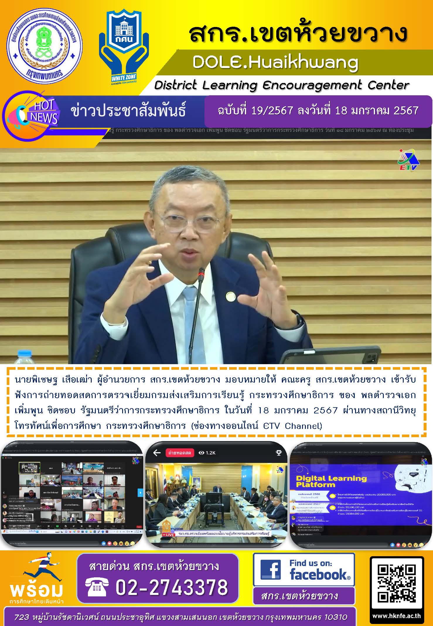 นายพิเชษฐ เสือเฒ่า ผู้อำนวยการ สกร.เขตห้วยขวาง มอบหมายให้ คณะครู สกร.เขตห้วยขวาง เข้ารับฟังการถ่ายทอดสดการตรวจเยี่ยมกรมส่งเสริมการเรียนรู้ กระทรวงศึกษาธิการ ของ พลตำรวจเอก เพิ่มพูน ชิดชอบ รัฐมนตรีว่าการกระทรวงศึกษาธิการ ในวันที่ 18 มกราคม 2567 ผ่านทางสถานีวิทยุโทรทัศน์เพื่อการศึกษา กระทรวงศึกษาธิการ (ช่องทางออนไลน์ ETV Channel)