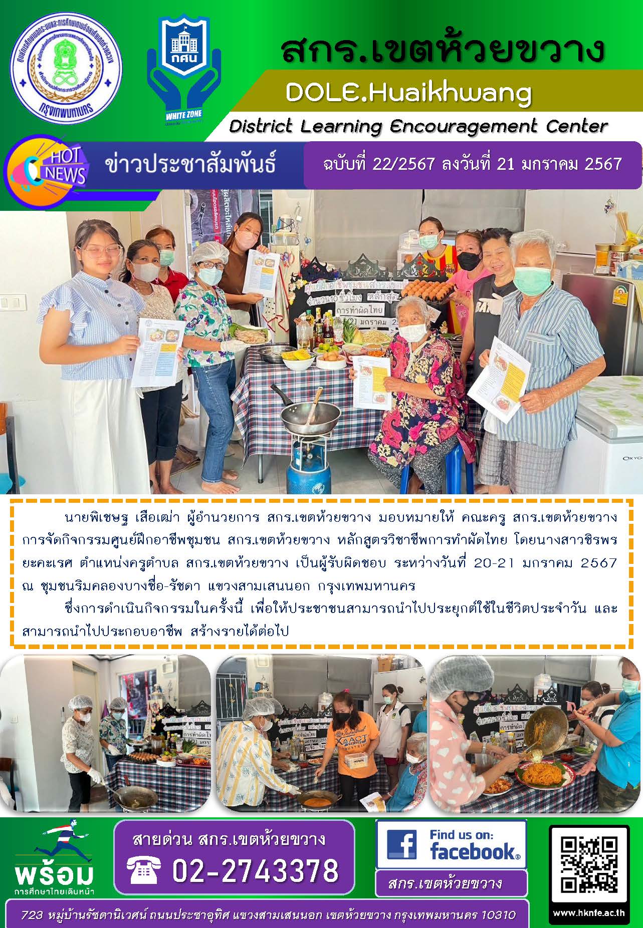 นายพิเชษฐ เสือเฒ่า ผู้อำนวยการ สกร.เขตห้วยขวาง มอบหมายให้ คณะครู สกร.เขตห้วยขวาง การจัดกิจกรรมศูนย์ฝึกอาชีพชุมชน สกร.เขตห้วยขวาง หลักสูตรวิชาชีพการทำผัดไทย โดยนางสาวชิรพร ยะคะเรศ ตำแหน่งครูตำบล สกร.เขตห้วยขวาง เป็นผู้รับผิดชอบ ระหว่างวันที่ 20-21 มกราคม 2567 ณ ชุมชนริมคลองบางซื่อ-รัชดา แขวงสามเสนนอก กรุงเทพมหานคร
