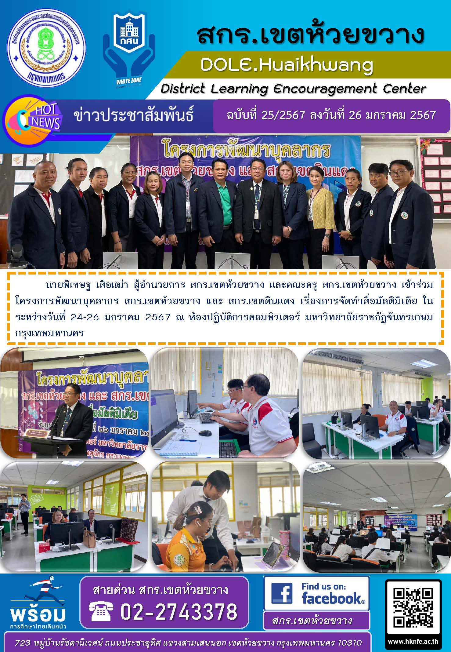 นายพิเชษฐ เสือเฒ่า ผู้อำนวยการ สกร.เขตห้วยขวาง และคณะครู สกร.เขตห้วยขวาง เข้าร่วมโครงการพัฒนาบุคลากร สกร.เขตห้วยขวาง และ สกร.เขตดินแดง เรื่องการจัดทำสื่อมัลติมีเดีย ในระหว่างวันที่ 24-26 มกราคม 2567 ณ ห้องปฏิบัติการคอมพิวเตอร์ มหาวิทยาลัยราชภัฏจันทรเกษม กรุงเทพมหานคร