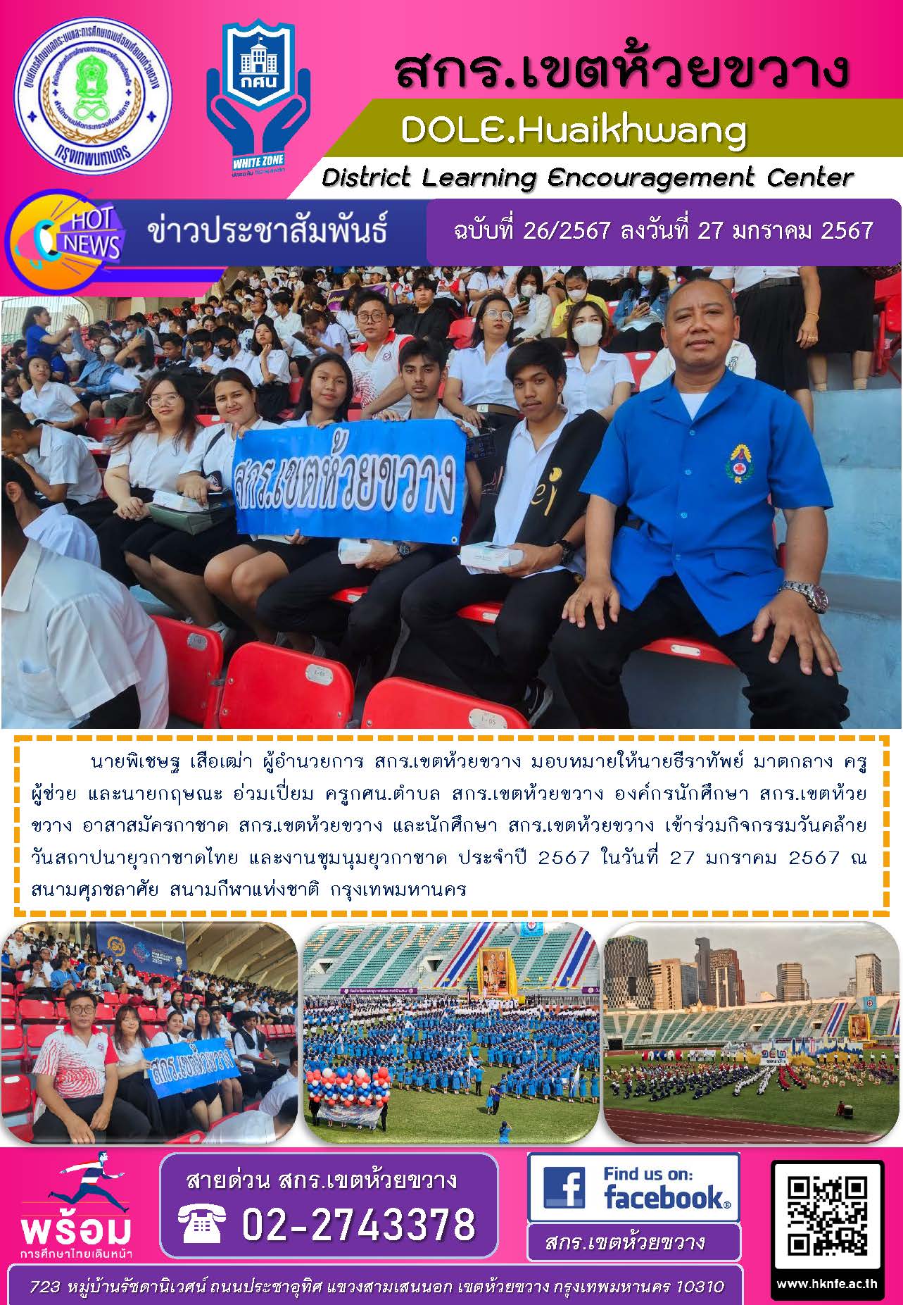 นายพิเชษฐ เสือเฒ่า ผู้อำนวยการ สกร.เขตห้วยขวาง มอบหมายให้นายธีราทัพย์ มาตกลาง ครูผู้ช่วย และนายกฤษณะ อ่วมเปี่ยม ครูกศน.ตำบล สกร.เขตห้วยขวาง องค์กรนักศึกษา สกร.เขตห้วยขวาง อาสาสมัครกาชาด สกร.เขตห้วยขวาง และนักศึกษา สกร.เขตห้วยขวาง เข้าร่วมกิจกรรมวันคล้ายวันสถาปนายุวกาชาดไทย และงานชุมนุมยุวกาชาด ประจำปี 2567 ในวันที่ 27 มกราคม 2567 ณ สนามศุภชลาศัย สนามกีฬาแห่งชาติ กรุงเทพมหานคร
