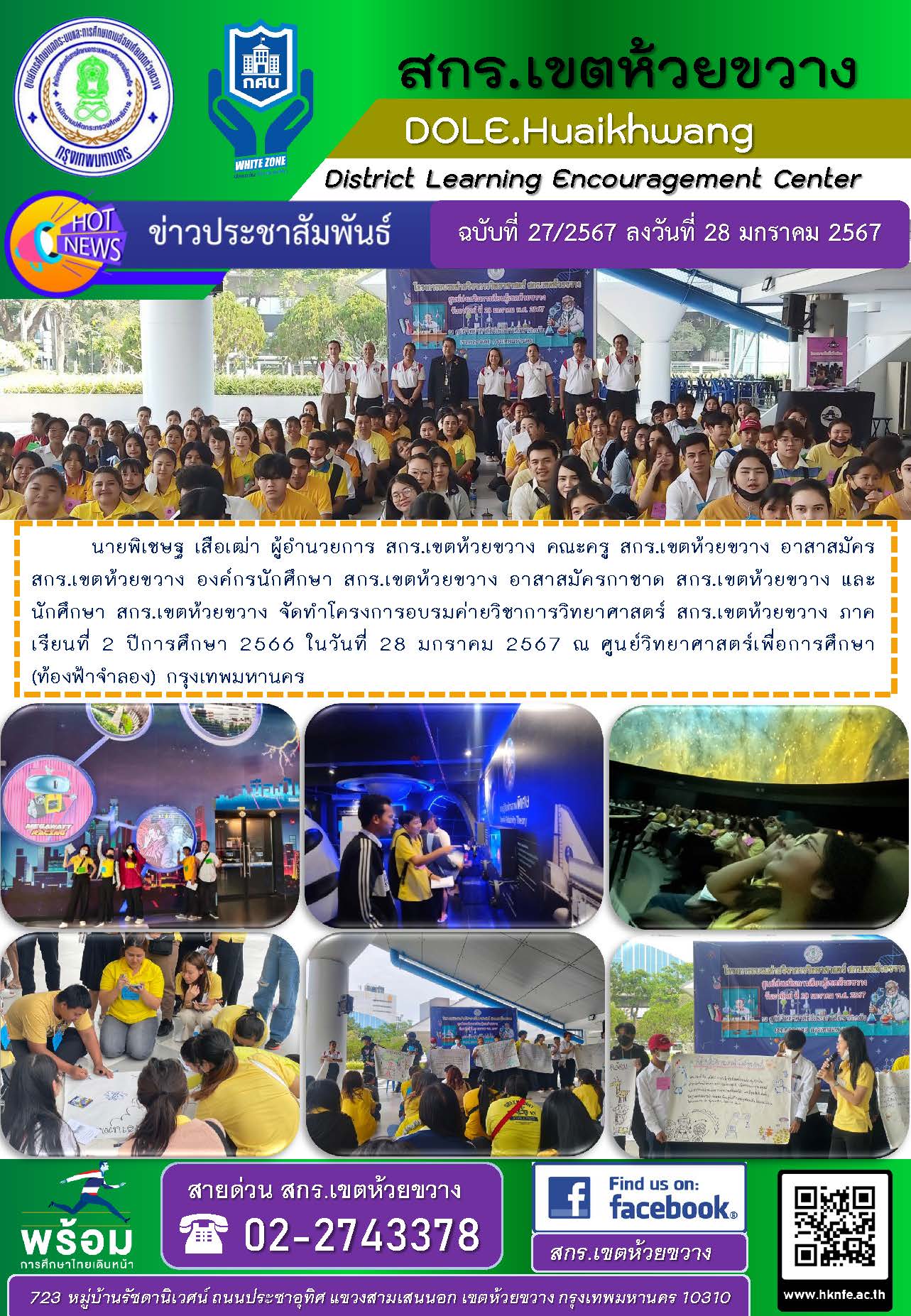 นายพิเชษฐ เสือเฒ่า ผู้อำนวยการ สกร.เขตห้วยขวาง คณะครู สกร.เขตห้วยขวาง อาสาสมัคร สกร.เขตห้วยขวาง องค์กรนักศึกษา สกร.เขตห้วยขวาง อาสาสมัครกาชาด สกร.เขตห้วยขวาง และนักศึกษา สกร.เขตห้วยขวาง จัดทำโครงการอบรมค่ายวิชาการวิทยาศาสตร์ สกร.เขตห้วยขวาง ภาคเรียนที่ 2 ปีการศึกษา 2566 ในวันที่ 28 มกราคม 2567 ณ ศูนย์วิทยาศาสตร์เพื่อการศึกษา (ท้องฟ้าจำลอง) กรุงเทพมหานคร