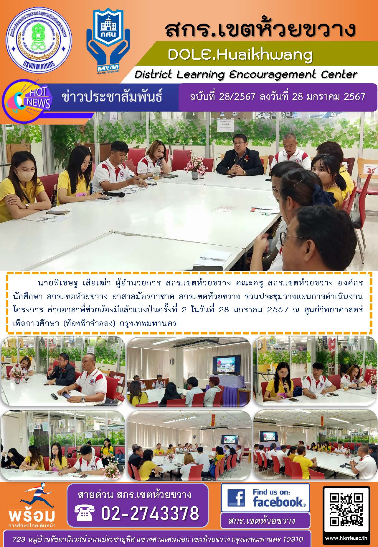 นายพิเชษฐ เสือเฒ่า ผู้อำนวยการ สกร.เขตห้วยขวาง คณะครู สกร.เขตห้วยขวาง องค์กรนักศึกษา สกร.เขตห้วยขวาง อาสาสมัครกาชาด สกร.เขตห้วยขวาง ร่วมประชุมวางแผนการดำเนินงานโครงการ ค่ายอาสาพี่ช่วยน้องมีแล้วแบ่งปันครั้งที่ 2 ในวันที่ 28 มกราคม 2567 ณ ศูนย์วิทยาศาสตร์เพื่อการศึกษา (ท้องฟ้าจำลอง) กรุงเทพมหานคร