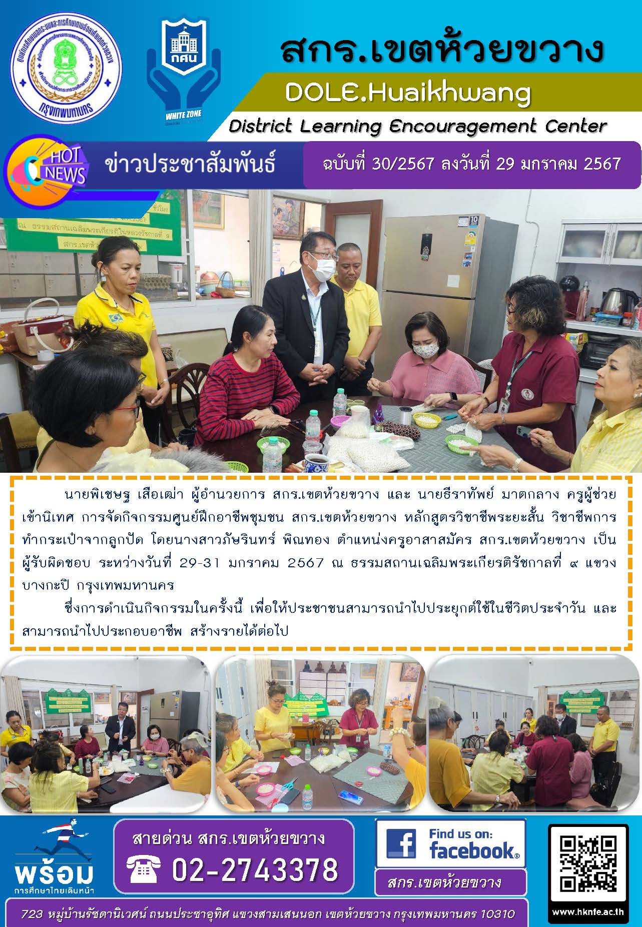 นายพิเชษฐ เสือเฒ่า ผู้อำนวยการ สกร.เขตห้วยขวาง และ นายธีราทัพย์ มาตกลาง ครูผู้ช่วย เข้านิเทศ การจัดกิจกรรมศูนย์ฝึกอาชีพชุมชน สกร.เขตห้วยขวาง หลักสูตรวิชาชีพระยะสั้น วิชาชีพการทำกระเป๋าจากลูกปัด โดยนางสาวภัษรินทร์ พิณทอง ตำแหน่งครูอาสาสมัคร สกร.เขตห้วยขวาง เป็นผู้รับผิดชอบ ระหว่างวันที่ 29-31 มกราคม 2567 ณ ธรรมสถานเฉลิมพระเกียรติรัชกาลที่ ๙ แขวงบางกะปิ กรุงเทพมหานคร