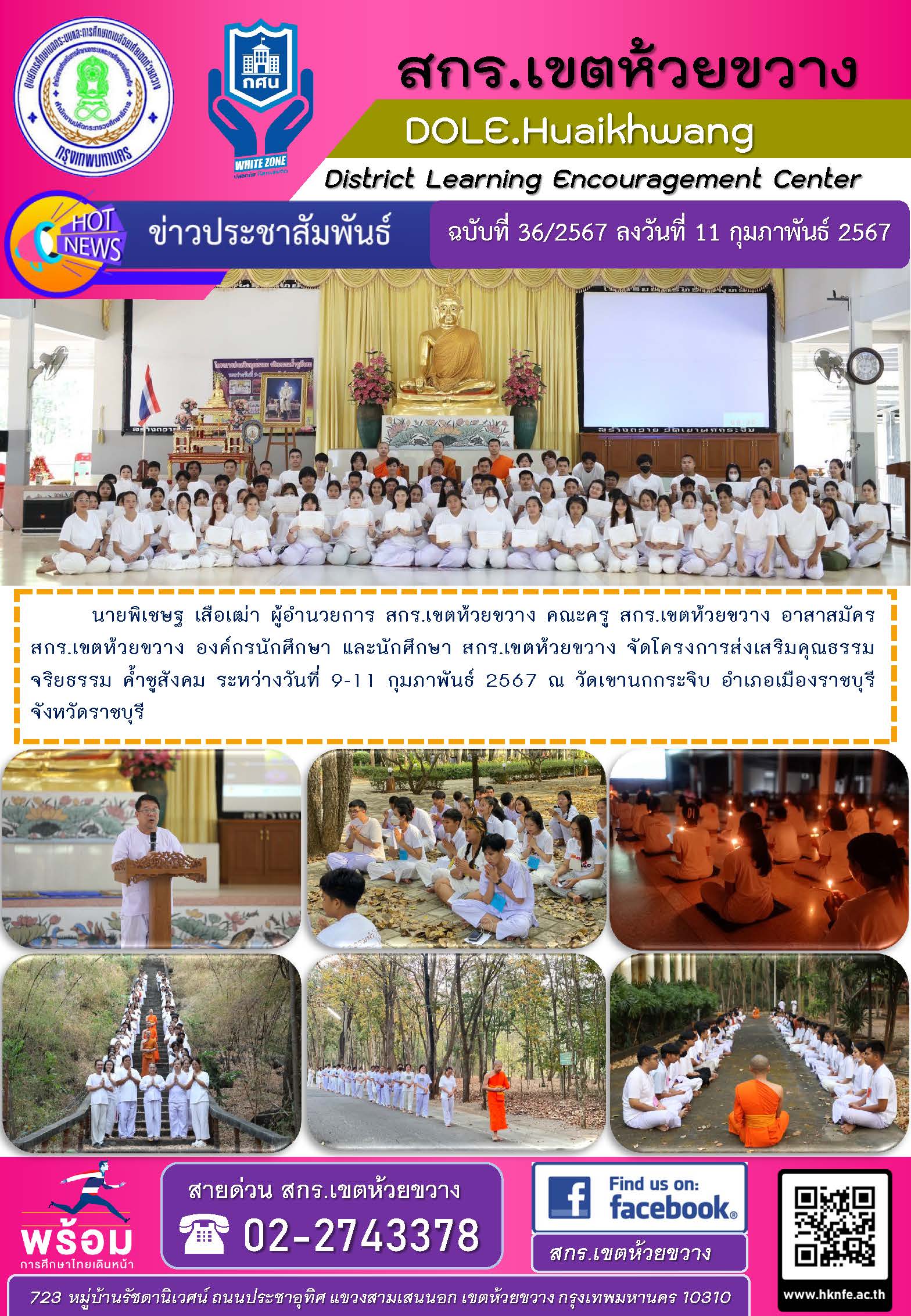 นายพิเชษฐ เสือเฒ่า ผู้อำนวยการ สกร.เขตห้วยขวาง คณะครู สกร.เขตห้วยขวาง อาสาสมัคร สกร.เขตห้วยขวาง องค์กรนักศึกษา และนักศึกษา สกร.เขตห้วยขวาง จัดโครงการส่งเสริมคุณธรรม จริยธรรม ค้ำชูสังคม ระหว่างวันที่ 9-11 กุมภาพันธ์ 2567 ณ วัดเขานกกระจิบ อำเภอเมืองราชบุรี จังหวัดราชบุรี