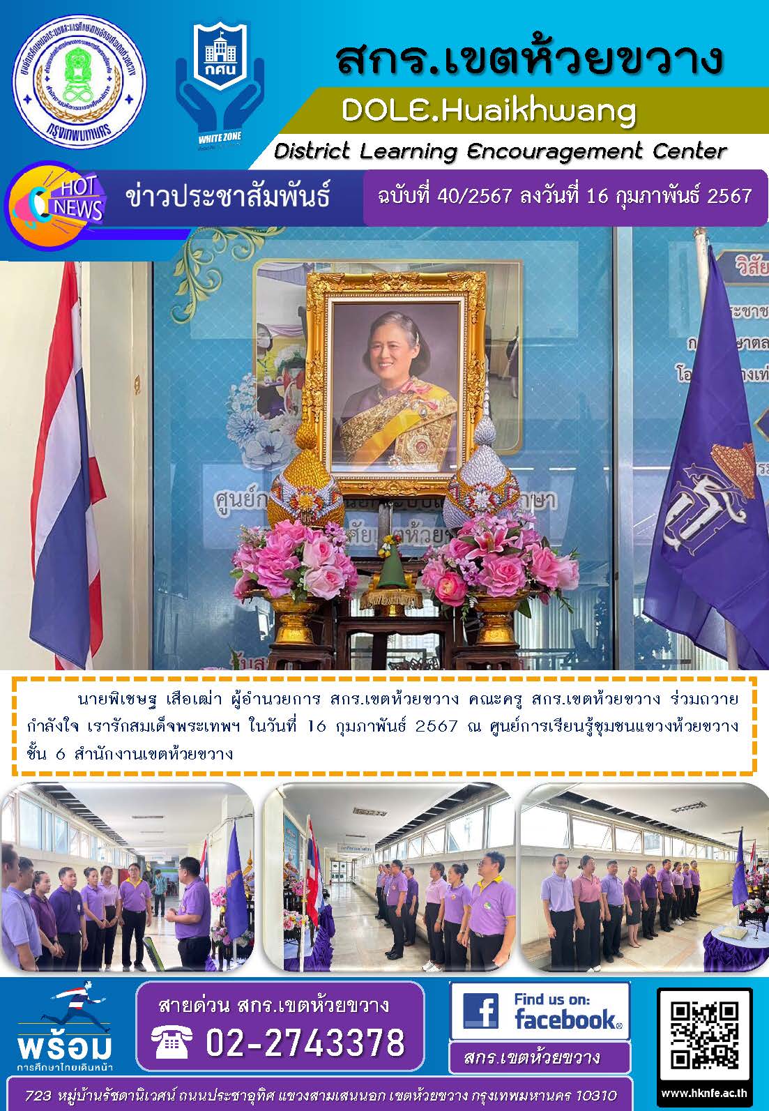 นายพิเชษฐ เสือเฒ่า ผู้อำนวยการ สกร.เขตห้วยขวาง คณะครู สกร.เขตห้วยขวาง ร่วมถวายกำลังใจ เรารักสมเด็จพระเทพฯ ในวันที่ 16 กุมภาพันธ์ 2567 ณ ศูนย์การเรียนรู้ชุมชนแขวงห้วยขวาง ชั้น 6 สำนักงานเขตห้วยขวาง