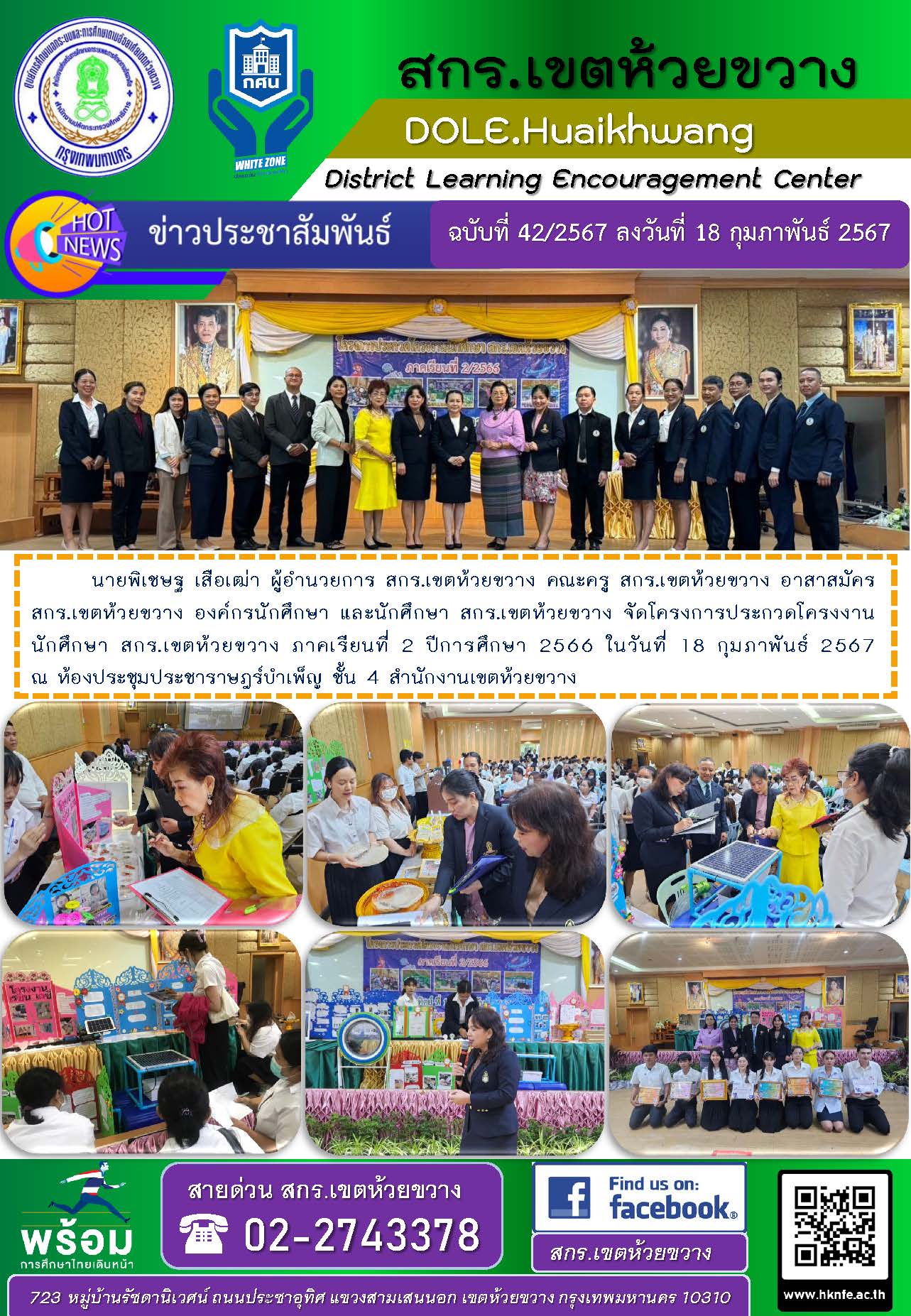 นายพิเชษฐ เสือเฒ่า ผู้อำนวยการ สกร.เขตห้วยขวาง คณะครู สกร.เขตห้วยขวาง อาสาสมัคร สกร.เขตห้วยขวาง องค์กรนักศึกษา และนักศึกษา สกร.เขตห้วยขวาง จัดโครงการประกวดโครงงานนักศึกษา สกร.เขตห้วยขวาง ภาคเรียนที่ 2 ปีการศึกษา 2566 ในวันที่ 18 กุมภาพันธ์ 2567 ณ ห้องประชุมประชาราษฎร์บำเพ็ญ ชั้น 4 สำนักงานเขตห้วยขวาง