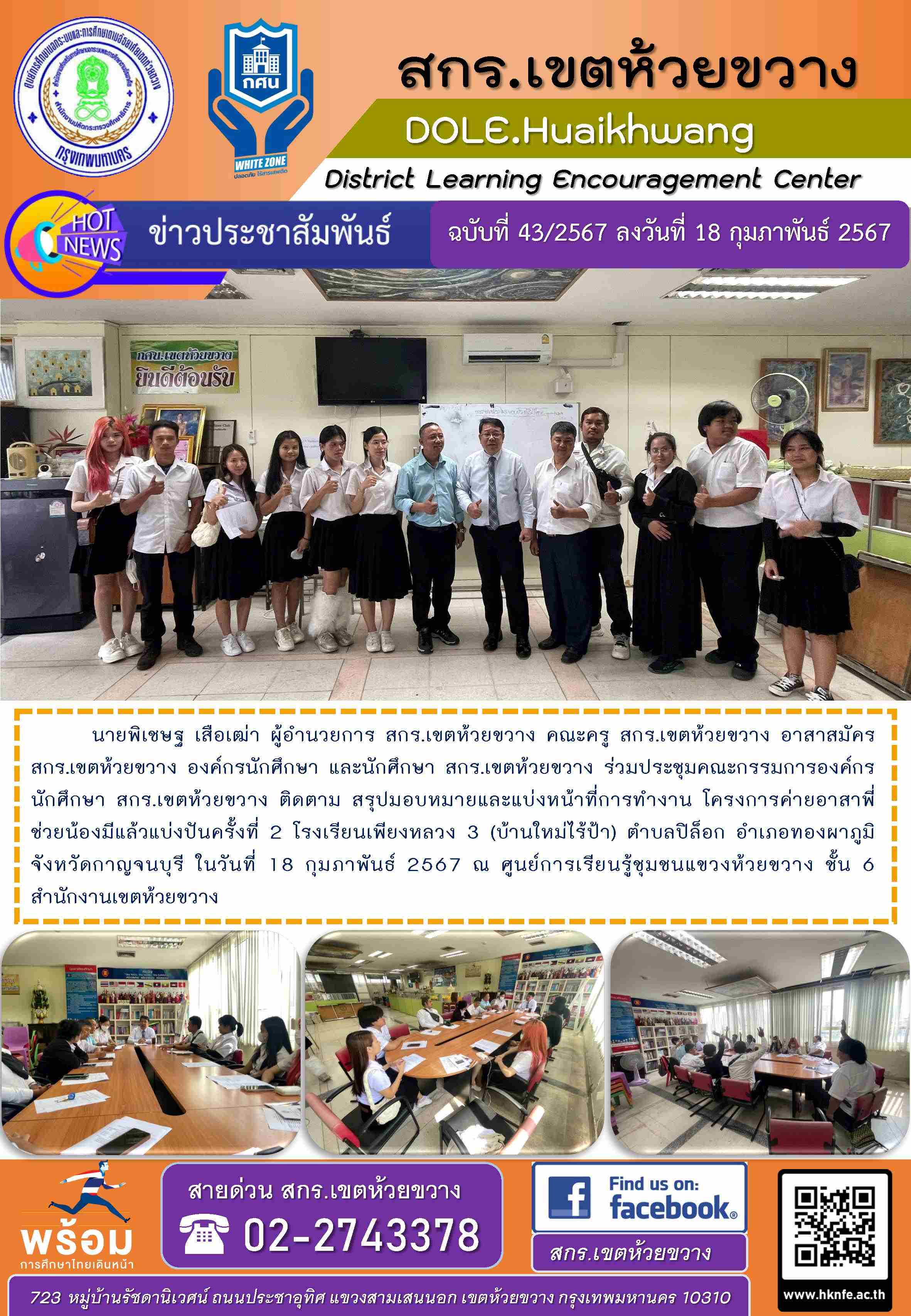 นายพิเชษฐ เสือเฒ่า ผู้อำนวยการ สกร.เขตห้วยขวาง คณะครู สกร.เขตห้วยขวาง อาสาสมัคร สกร.เขตห้วยขวาง องค์กรนักศึกษา และนักศึกษา สกร.เขตห้วยขวาง ร่วมประชุมคณะกรรมการองค์กรนักศึกษา สกร.เขตห้วยขวาง ติดตาม สรุปมอบหมายและแบ่งหน้าที่การทำงาน โครงการค่ายอาสาพี่ช่วยน้องมีแล้วแบ่งปันครั้งที่ 2 โรงเรียนเพียงหลวง 3 (บ้านใหม่ไร้ป้า) ตำบลปิล็อก อำเภอทองผาภูมิ จังหวัดกาญจนบุรี ในวันที่ 18 กุมภาพันธ์ 2567 ณ ศูนย์การเรียนรู้ชุมชนแขวงห้วยขวาง ชั้น 6 สำนักงานเขตห้วยขวาง