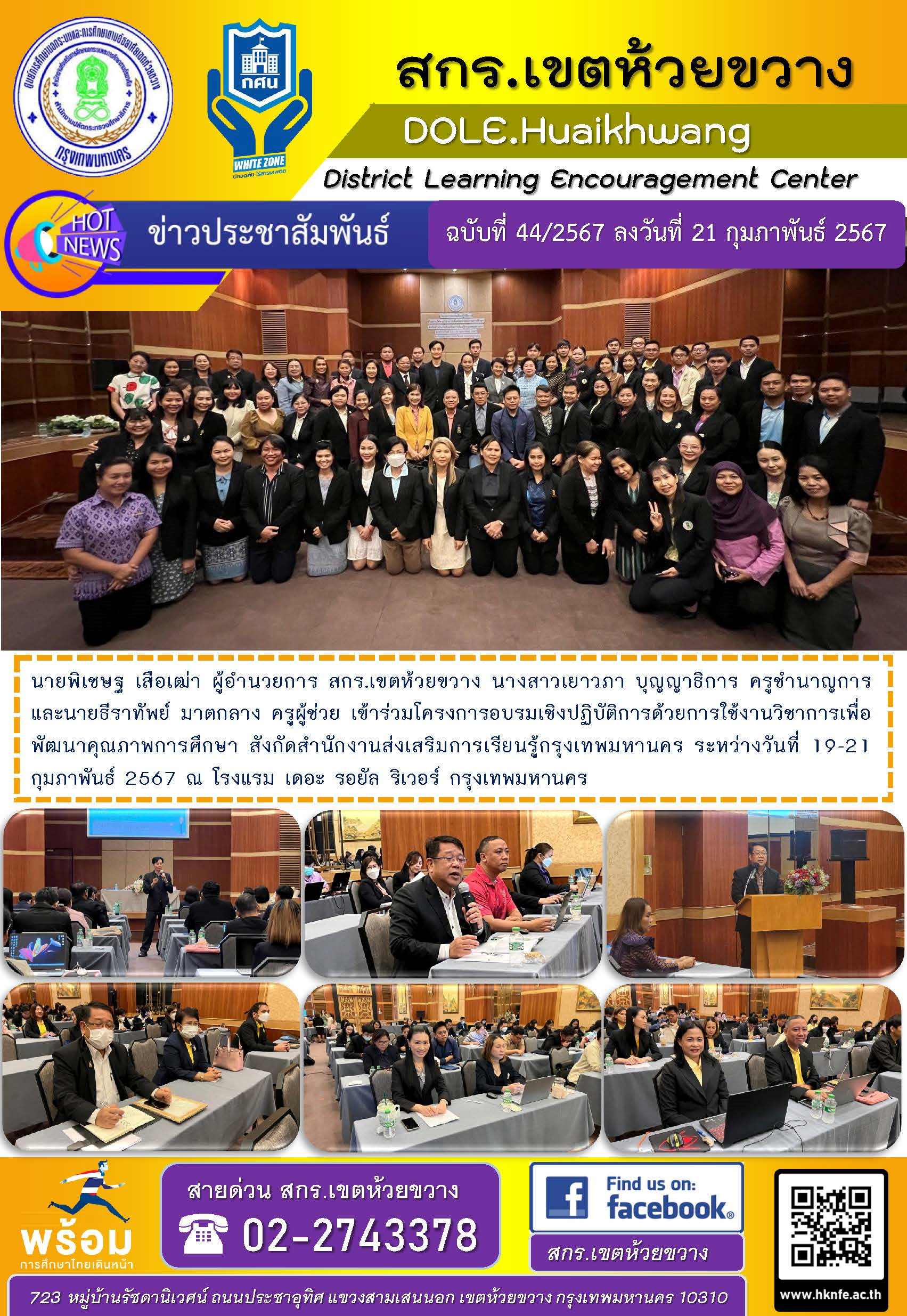 นายพิเชษฐ เสือเฒ่า ผู้อำนวยการ สกร.เขตห้วยขวาง นางสาวเยาวภา บุญญาธิการ ครูชำนาญการ และนายธีราทัพย์ มาตกลาง ครูผู้ช่วย เข้าร่วมโครงการอบรมเชิงปฏิบัติการด้วยการใช้งานวิชาการเพื่อพัฒนาคุณภาพการศึกษา สังกัดสำนักงานส่งเสริมการเรียนรู้กรุงเทพมหานคร ระหว่างวันที่ 19-21 กุมภาพันธ์ 2567 ณ โรงแรม เดอะ รอยัล ริเวอร์ กรุงเทพมหานคร