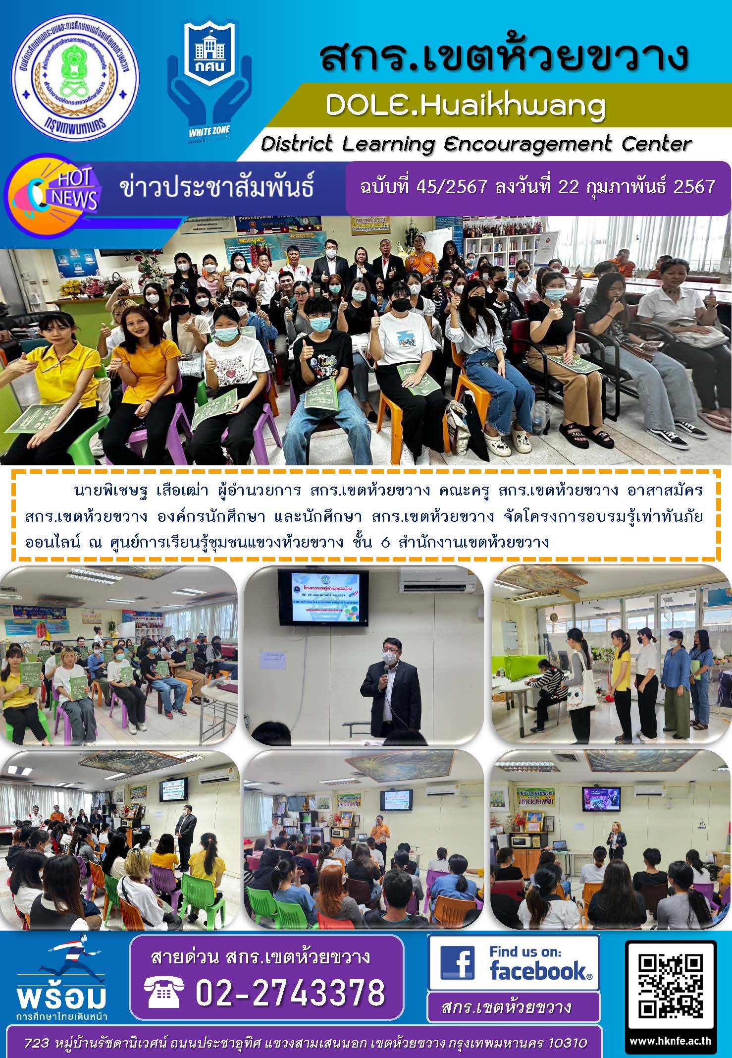 นายพิเชษฐ เสือเฒ่า ผู้อำนวยการ สกร.เขตห้วยขวาง คณะครู สกร.เขตห้วยขวาง อาสาสมัคร สกร.เขตห้วยขวาง องค์กรนักศึกษา และนักศึกษา สกร.เขตห้วยขวาง จัดโครงการอบรมรู้เท่าทันภัยออนไลน์ ในวันที่ 22 กุมภาพันธ์ 2567 ณ ศูนย์การเรียนรู้ชุมชนแขวงห้วยขวาง ชั้น 6 สำนักงานเขตห้วยขวาง