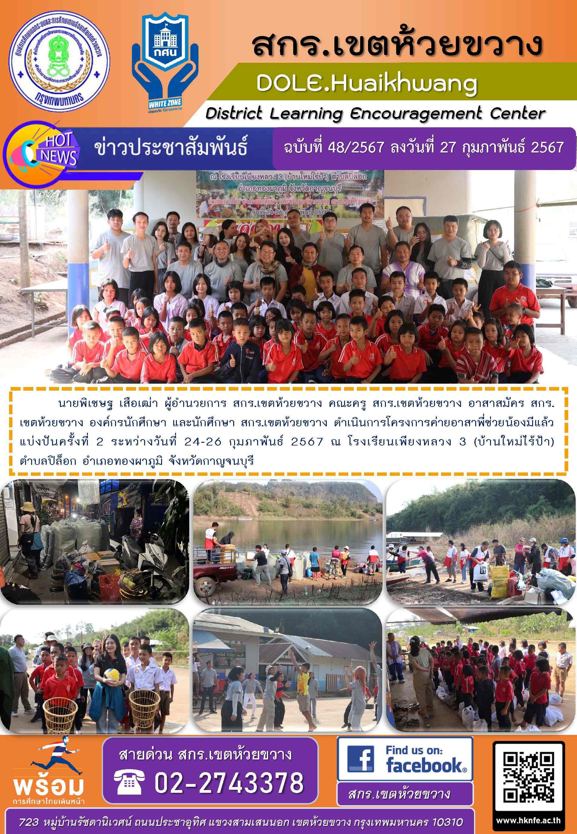 นายพิเชษฐ เสือเฒ่า ผู้อำนวยการ สกร.เขตห้วยขวาง คณะครู สกร.เขตห้วยขวาง อาสาสมัคร สกร.เขตห้วยขวาง องค์กรนักศึกษา และนักศึกษา สกร.เขตห้วยขวาง ดำเนินการโครงการค่ายอาสาพี่ช่วยน้องมีแล้วแบ่งปันครั้งที่ 2 ระหว่างวันที่ 24-26 กุมภาพันธ์ 2567 ณ โรงเรียนเพียงหลวง 3 (บ้านใหม่ไร้ป้า) ตำบลปิล็อก อำเภอทองผาภูมิ จังหวัดกาญจนบุรี